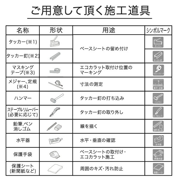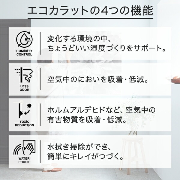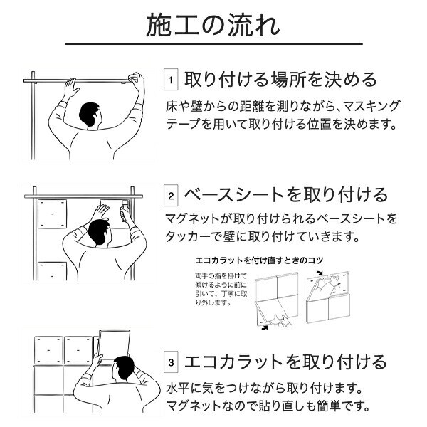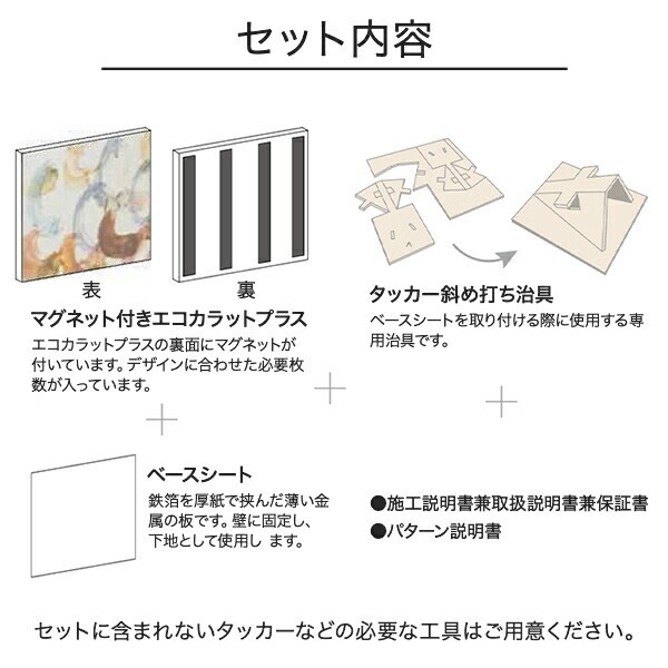 | 商品説明 | ●取付け、取外し簡単でリフォームにおすすめ ●別のマグネット付きエコカラットに付け替え可能 ●変化する環境の中、ちょうどいい湿度づくりをサポート ●空気中のにおいをl吸着・低減 ●ホルムアルデヒドやトルエンなど空気中の有害物質を吸収し低減 ●水拭き掃除ができるので簡単にキレイがつづく ●適用不可:屋外、浴室、床、キッチンバック ●コンクリートの壁には施工できません。 ●傾きのある壁・凹凸のある壁には施工できません。 ●電動タッカー・エアタッカー・ハンマータッカーはご使用にならないでください。必ずハンドタッカーをご使用ください。 ●タッカー釘は、横幅10~13mm・足長さ8~14mmを必ずご使用ください。 |