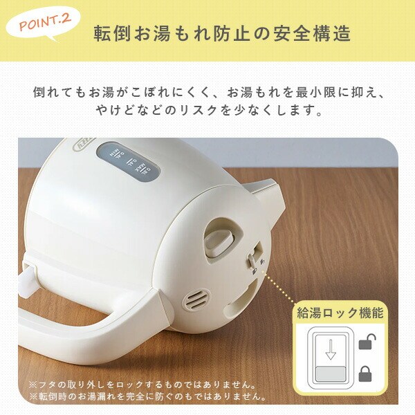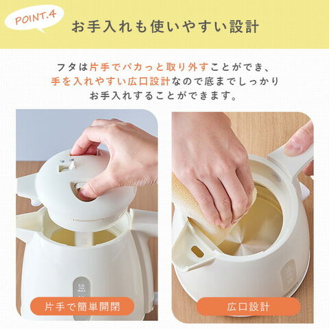 | 商品説明 | ●電源:AC100V(50/60Hz) ●定格消費電力:900W ●定格容量:0.8L ●電源コード長:約0.75m ●付属品:ユーザーズガイド(保証書含む) ●倒れてもお湯がこぼれにくい転倒お湯もれ防止機能搭載 ●空焚き自動OFF機能搭載 ●シンプルで使いやすく普段使いに最適 |
