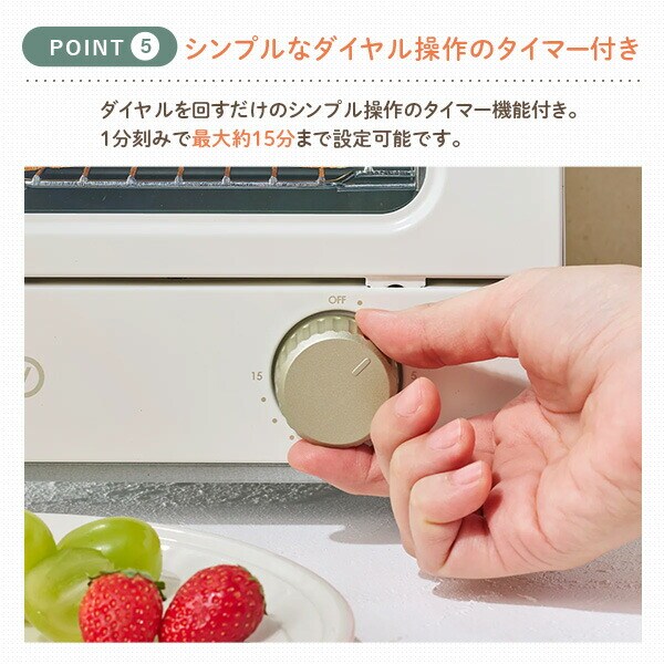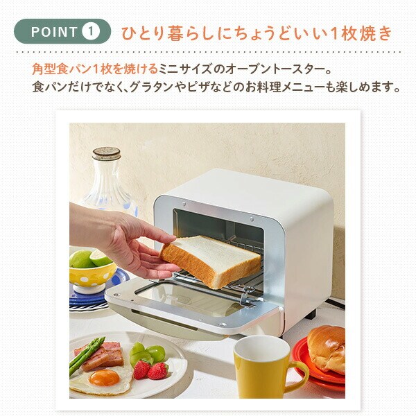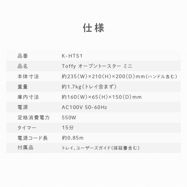 | 商品説明 | ●電源:AC100V(50/60Hz) ●定格消費電力:550W ●庫内寸法:幅16×奥行15×高さ6.5cm ●電源コード長:約0.85m ●タイマー:15分 ●付属品:トレイ、ユーザーズガイド(保証書含む) ●一人暮らしにピッタリのかわいらしいミニサイズ ●食パン1枚焼き ●15分タイマーつきで料理の幅も広がる |