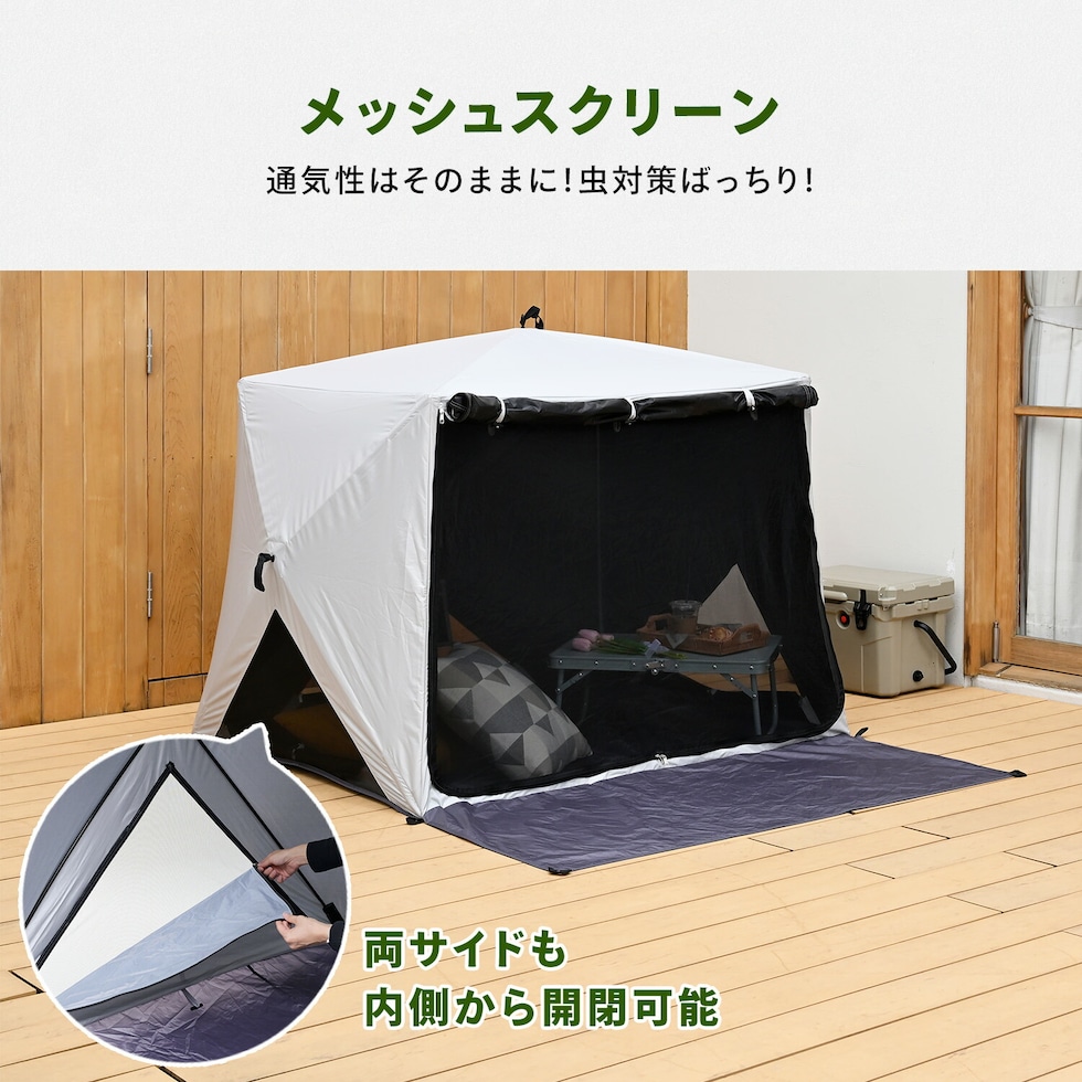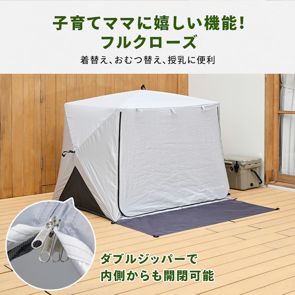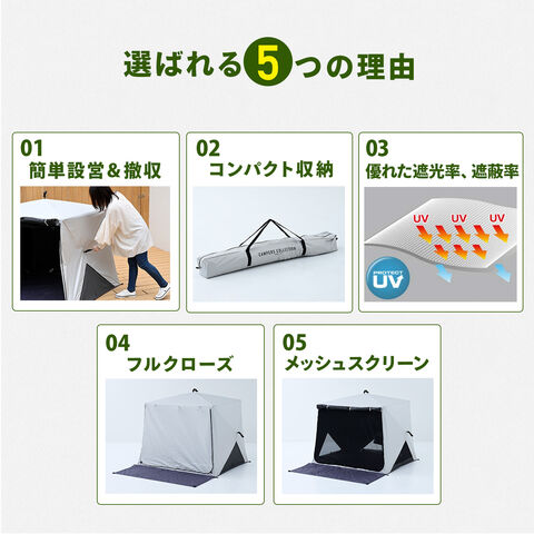 | 商品説明 | ●意匠登録済 ●実用新案登録済 ※本製品の類似品・模倣品の販売は法律により禁止されております。類似品・模倣品を発見した場合は法的処置を取らせていただきます。 ●10秒設営、10秒撤収 ※設営:組み立て時間、撤収:たたむまで ●UV遮蔽率:99.9% ●遮光率:99.99% ●耐水圧:9780ml ●フルクローズ機能で着替えもできる ●メッシュ機能で虫を寄せ付けずに風通しできます ●棒状にコンパクト収納されるので持ち運びがラクラク ●両面ファスナーで内側からも開閉可能 ●独立フロントシート ●取り外し可能なポケット付きでスマホやタオルの収納に! ●付属品:ペグ11本、ガイドロープ5本、キャリーバッグ ●テント折りたたみ時サイズ:幅12×奥行13×長さ94cm ※この商品は、2026年1月9日より一部仕様変更をしております 【変更内容】 ・より通気性をよくするため背面もメッシュ仕様に ●ジョイントシート折りたたみ時サイズ:幅21×奥行12×高さ60cm ●折りたたみ式で巻きぐせの無いフラット性に優れたレジャーマット ●収納用ゴムベルト付き ●収納時に座る面と裏面が重ならないので座る面はいつでもきれいに保てる |