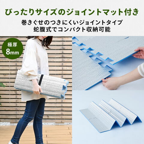 | 材質 | (テント)ポリエステル、グラスファイバーポール (ジョイントシート)発泡ポリエチレン、PPフィルム、アルミ蒸着PETフィルム |