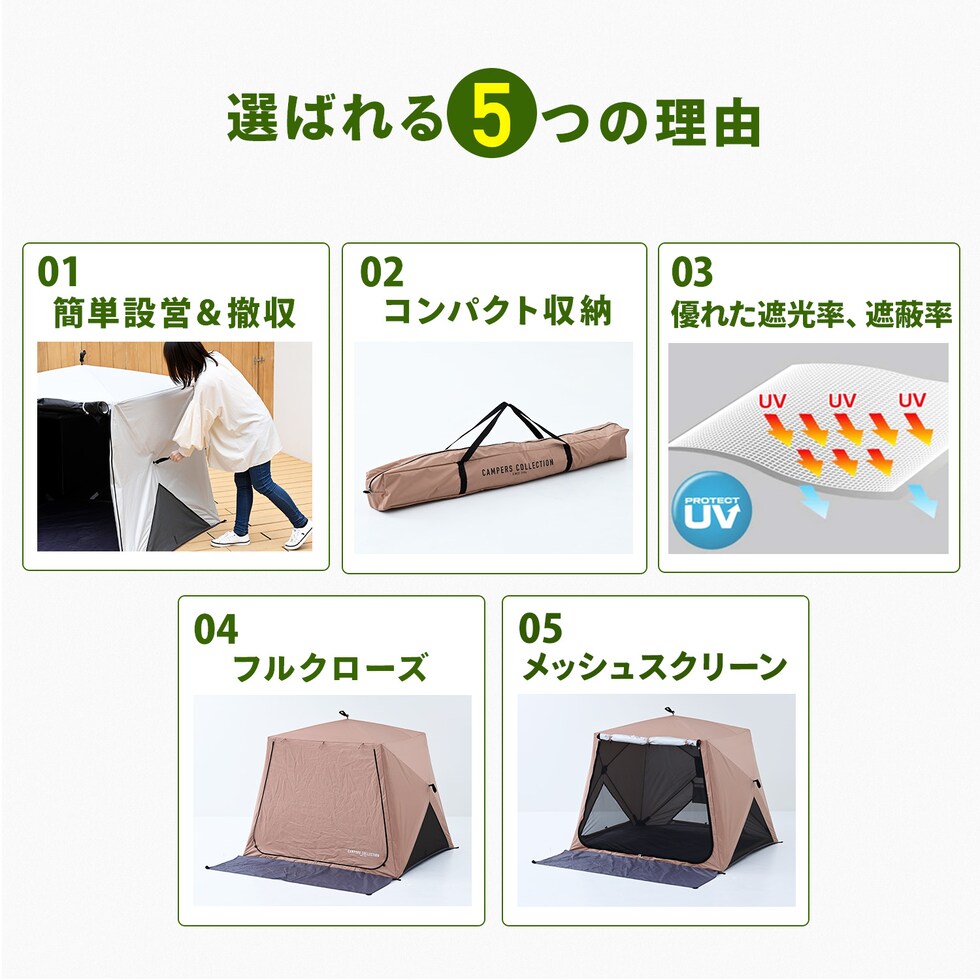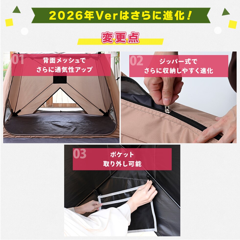 | 商品説明 | ●意匠登録済 ●実用新案登録済 ※本製品の類似品・模倣品の販売は法律により禁止されております。類似品・模倣品を発見した場合は法的処置を取らせていただきます。 ●10秒設営、10秒撤収 ※設営:組み立て時間、撤収:たたむまで ●UV遮蔽率:98.9% ●遮光率:98.77% ●耐水圧:2920ml ●フルクローズ機能で着替えもできる ●メッシュ機能で虫を寄せ付けずに風通しできます ●棒状にコンパクト収納されるので持ち運びがラクラク ●両面ファスナーで内側からも開閉可能 ●独立フロントシート ●取り外し可能なポケット付きでスマホやタオルの収納に! ●付属品:ペグ11本、ガイドロープ5本、キャリーバッグ ●テント折りたたみ時サイズ:幅13×奥行13.5×長さ111.5cm ※この商品は、2026年1月9日より一部仕様変更をしております 【変更内容】・より通気性をよくするため背面もメッシュ仕様に ・アッシュグレー→モカムース色に変更 ●ジョイントシート折りたたみ時サイズ:幅21×奥行13.5×高さ68cm ●折りたたみ式で巻きぐせの無いフラット性に優れたレジャーマット ●収納用ゴムベルト付き ●収納時に座る面と裏面が重ならないので座る面はいつでもきれいに保てる |