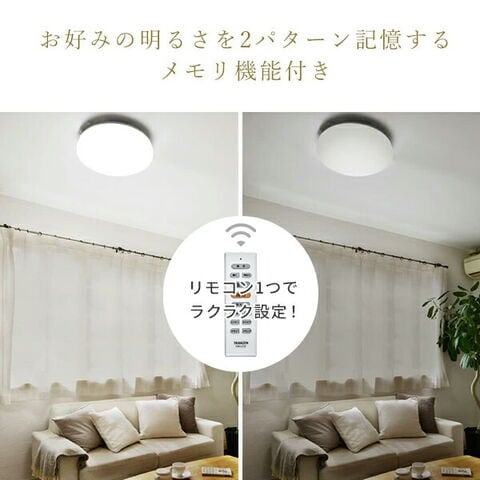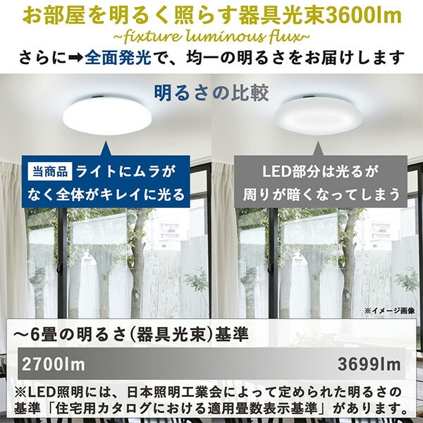 | 商品説明 | ●電源:AC100V(50Hz/60Hz) ●器具光束:(最大) ●6畳:3600lm ●8畳:4100lm(間接照明機能付きは4280lm) ●12畳:5300lm ●機能:明るさ10段階、調色10段階(調色タイプのみ) ●30・60分OFFタイマー ●ワイヤレスリモコン付き ●取付できる配線器具:角型引掛シーリング、丸型引掛シーリング、丸型フル引掛シーリング、フル引掛ローゼット、引掛埋込ローゼット、ローゼット ●メーカー保証:1年 ●2025年6月より間接照明機能タイプの6畳、8畳用を追加しています。 |