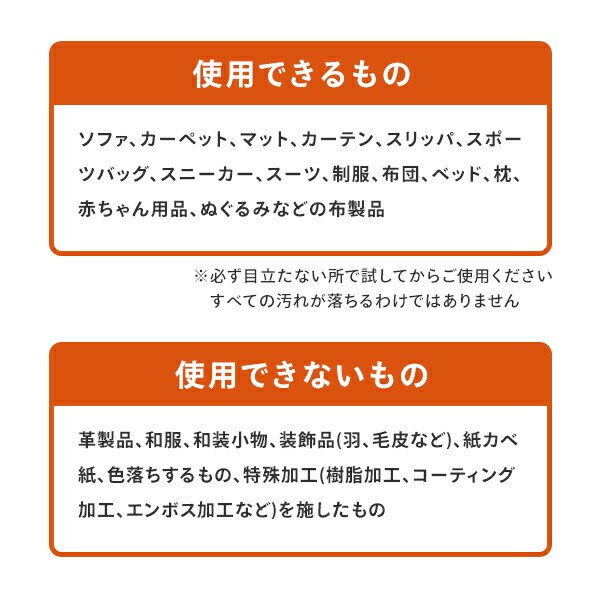 | 商品説明 | ●スプレーして拭き取るだけ! ●洗濯機では洗いにくい布製品をキレイにすると共に消臭&除菌 ●食品にも使われる洗浄成分(オレンジオイル)を配合 ●天然さとうきびの消臭成分配合のため、お子様やペットがいるご家庭でも安心 ●2度拭き不要 ●正味量:250mL ●液性:中性 ●使用量の目安:1平方メートルあたり4mL(約13回スプレー) ※必ず目立たない所で試してからご使用ください ※すべての汚れが落ちるわけではありません |