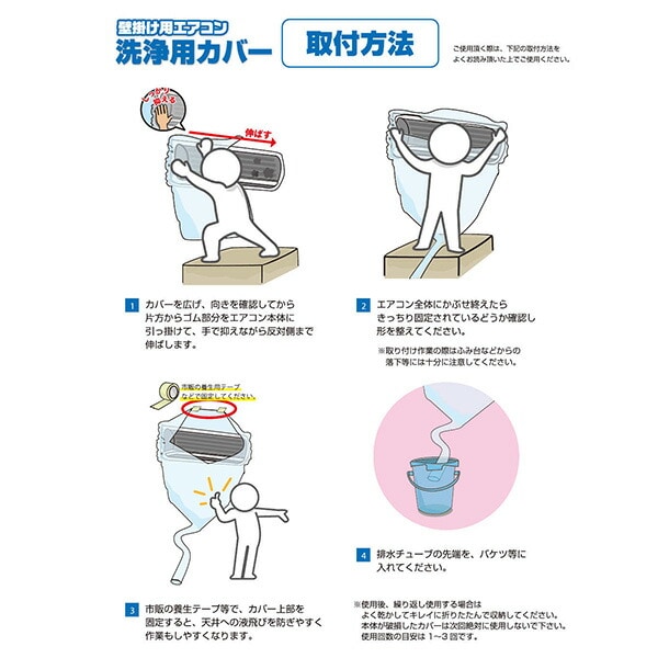 | 商品説明 | ●ゴム入りでかぶせるだけ簡単取付 ●幅90cmまで対応 ●排水チューブ3m ●扱いやすいPEフィルム採用で洗浄簡単 ※取扱い上のご注意 ●使用前に破れ等がないかチェックしてください ●破れ等があった場合は絶対に使用しないでください ●本製品の使用は1~3回を目安、限度としてください ●フィルムやゴムの消耗・摩耗・破損により製品が落下したり洗浄液の漏れ等の原因になりますので、使用回数目安の1~3回を超えて繰り返し使用せず、早めの交換をおすすめします ●洗浄作業時は周辺を十分に養生してください ●エアコン本体への取付が不十分な時は、市販のテープ等を利用ししっかり固定してください ●洗浄終了後カバーを外す時は、カバーに付着している水気を十分に切ってから外してください ●カバーを引っ張りすぎたり、突起物に当てるとフィルムの材質上破れることがありますので、扱いには十分ご注意ください ●直射日光の当たる場所、高温な場所では保管しないでください ●取り付け作業の際はふみ台などからの落下等には十分に注意してください |