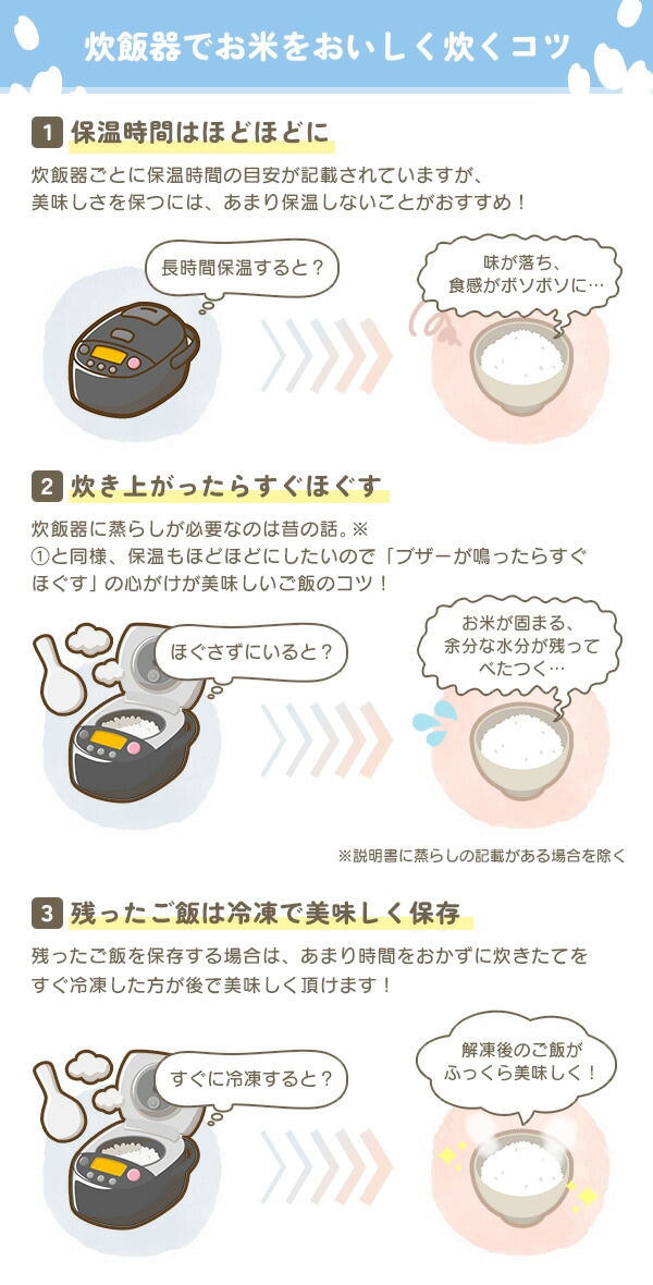 | 商品説明 | ●電源:AC100V(50/60Hz) ●消費電力:900W ●電源コード長さ:約1m ●最大炊飯容量:1L(5.5合) ●炊飯方式:IH式 ●蒸発水量:6.5g ●年間消費電力:82.7kWh/年 ●1回当たりの炊飯時消費電力:166.2Wh ●1時間当たりの保温時消費電力:15.8Wh ●1時間当たりのタイマー予約時消費電力:0.55Wh ●1時間当たりの待機時消費電力:0.42Wh ●9種類のメニュー搭載 ●タイマーは最大24時間まで設定可能 ●内釜・しゃもじ・内ぶた、蒸気キャップは丸洗い対応 ●マグネットコード採用 ●本体ハンドル付きで持ち運びに便利 ●付属品:しゃもじ、計量カップ、電源コード ●メーカー保証:1年間 |