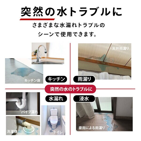 | 商品説明 | ●置くだけで水分を吸収する防災用吸水シート(10枚入) ●吸水量:7L(1枚あたり) ●大雨、台風時の浸水対策、水漏れの備えに ●玄関、キッチン、トイレ、お風呂などの水漏れ・浸水対策としても便利 ※吸水後の再利用は出来ません ※止水材としての使用及び油・溶剤・海水等の吸水はできません ※水質・水温等により、吸水値・吸水スピードは異なります |