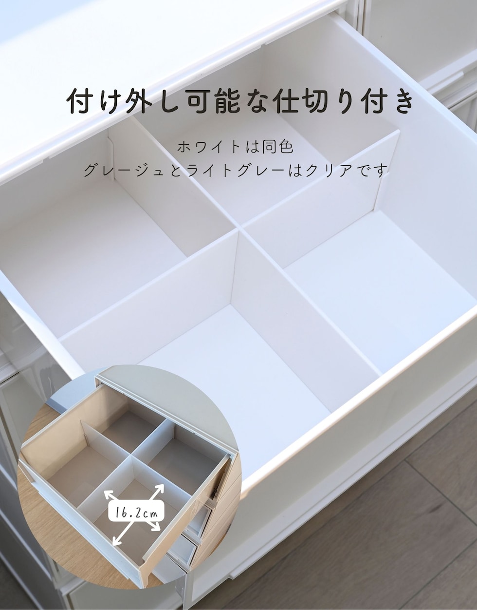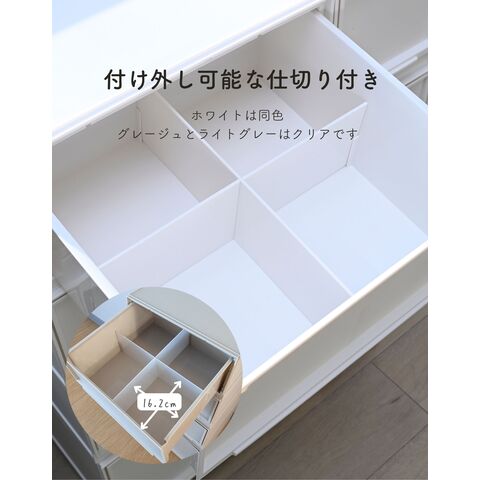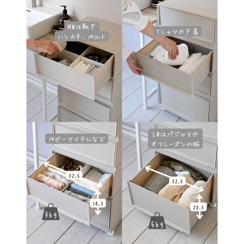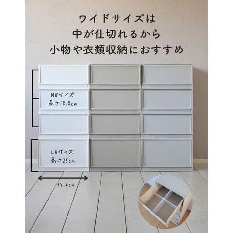 | 商品説明 | ●クローゼットや洗面所、リビングや机の上など、おうちのあらゆる場所で使える中が透けないプラスチックタイプ ●ホコリが入りにくい側面と裏面 ●MWサイズ3個とLWサイズ1個の合計4個セット ●取り外し可能なキャスター付き ●スムーズな開閉の引き出し ●引き出しはストッパー付きで、引き出し過ぎてもズレ落ち防止 ●引っかかりのないスムーズな開閉 ●スタッキング時にずれ防止の連結パーツ付き ●キャスターを使わない時用の滑り止めも付属 ●キャスターの高さ:4.3cm ●キャスター取り付け時の耐荷重: 10kg ●【MWサイズ】 ●1個当たり 幅37.6×奥行き35.5×高さ18.8cm 重量1.45kg ●十字に仕切るとハンカチや靴下などの小物収納にぴったりなMサイズ ●仕切りを外すとTシャツやパンツ、服の収納に適切な深さ ●CDの収納目安: 2列で約60 ●内寸: 幅14.3×奥行32.6(間口25.6)×高さ14.3cm ●耐荷重: 3kg ●仕切り2枚(グレージュ、ライトグレーはクリアです) ●【LWサイズ】 ●1個当たり 幅37.6×奥行き35.5×高さ25cm 重量1.67kg ●タオルやオフシーズンの洋服を入れやすいLサイズ ●DVDの収納目安: 2列で約40枚 ●内寸: 幅14.3×奥行32.6(間口25.6)×高さ20.5cm ●耐荷重: 5kg ●仕切り2枚(グレージュ、ライトグレーはクリアです) |