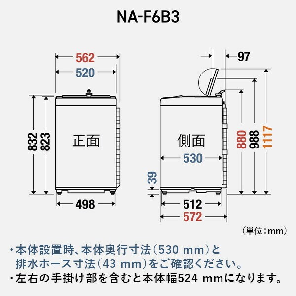 | 商品説明 | ●洗濯・脱水容量:6kg ●標準使用水量:約116L ●目安時間:約42分 ●運転音:洗濯時37dB/脱水時46dB ●コース:おまかせ/すすぎ1回/お急ぎ/手洗い/毛布/つけおき/槽洗浄(1時間)/槽洗浄(11時間)/槽乾燥 ●対応防水フロアー:奥行(内寸)54cm以上 ●付属品:給水ホース、外部排水ホース、保護カバー |