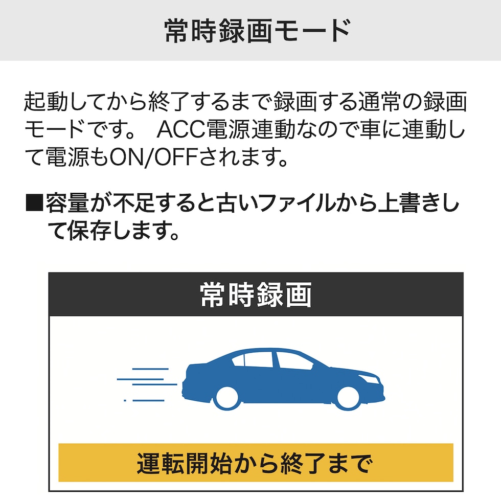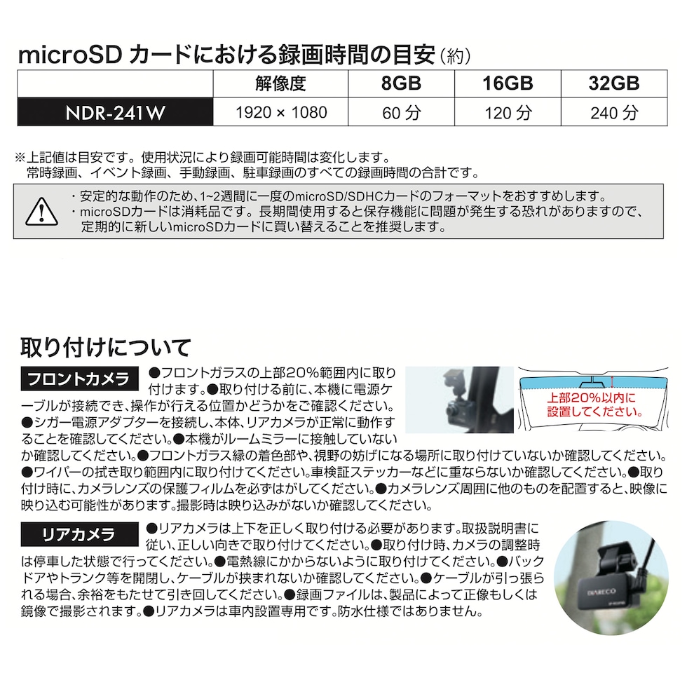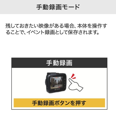 | 商品説明 | ●運転中の万が一をしっかり記録 ●microSDカード:8~32GB(Class10以上) ●フロントカメラ:200万画素 ●視野角:対角130度/水平100度/垂直80度 ●解像度:FHD1920×1080 ●フレームレート:27.5fps ●マイク、スピーカー内蔵 ●Gセンサー:3軸Gセンサー ●入力電源:DC12V/24Vに対応 ●電源電圧:DC5V ●最大消費電流:1100mA ●動作温度:-10~60度 ●録画:常時 1分、イベント録画および手動録画の録画時間は常時録画に連動します。 ●動画ファイル形式:MP4 ※一般の動画プレイヤーで再生できます。それぞれのコーデックが再生可能なプレーヤーが必要です。 ●付属品:専用シガー電源アダプター、ケーブル固定クランプ、microSDカード(16GB Class10)、取り扱い説明書件保証書 |