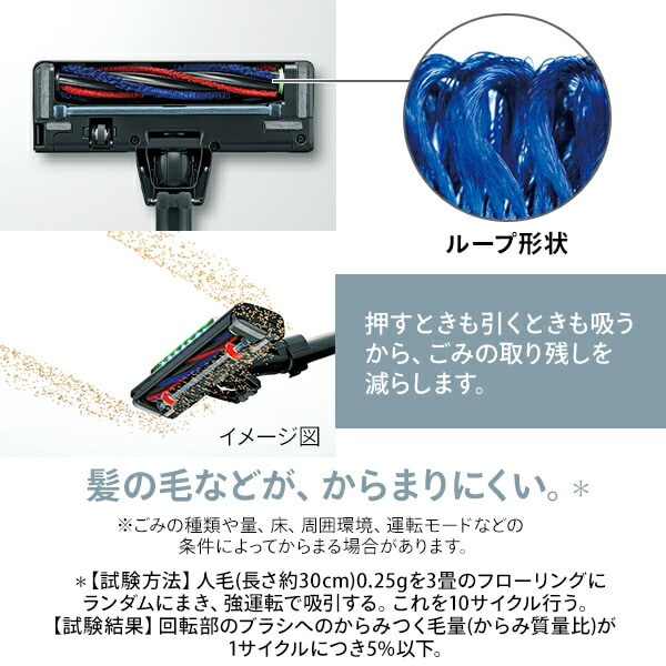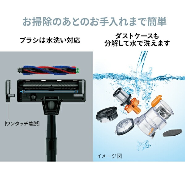 | 商品説明 | ●軽量1.5kgのサイクロン式クリーナー ●ヘッド幅約23cmの自走式パワフルスマートヘッド搭載 ●ゴミくっきりライト:見えにくいゴミを浮かび上がらせる緑色LEDライト ●からまんブラシ:髪の毛などがからまりにくいループ形状のブラシ ●からまんプレス構造:ダストケースは髪の毛などがからまりにくくお手入れがラク ●ブラシとダストケースは水洗い対応 ●立てかけて使用できるスティックスタンド付き ●連続使用時間:(強)約8分、(自動)約8-40分、(標準)約60分 ●充電時間:約2.5時間 ●電池定格電圧:21.6V ●集じん容積:0.15L ●電池:カセット式リチウムイオン電池 ●付属品:ハンディブラシ、すき間用吸口、延長パイプ、スティックスタンド、ACアダプター、お手入れブラシ ※連続使用時間、充電時間は一般社団法人日本電機工業会自主基準(HD-10)により測定。満充電、電池初期、室温20℃時。数値は使用方法、周囲温度、電池残量などの条件で異なります |