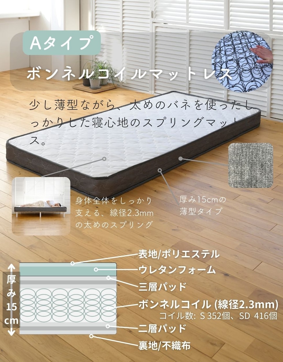 中材: コイルスプリング、ウレタンフォーム、フェルト(ポリエステル)