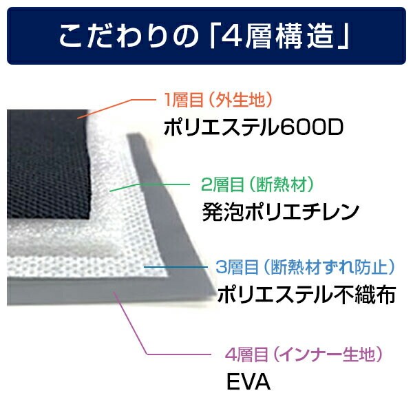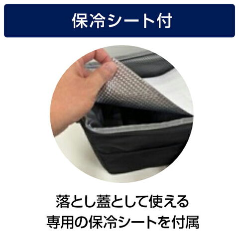 | 材質 | 表面生地:ポリエステル 中材:発泡ポリエチレン インナー:EVA 持ち手、縁巻:PP 底板:PE 保冷シート:発泡ポリエチレン、アルミ蒸着、PETフィルム |