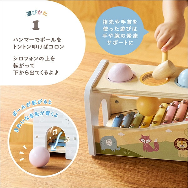 | 商品説明 | ●対象年齢:18か月から ●ハンマー遊びと楽器遊びが楽しめるハンマーシロフォン ●ハンマーでボールを叩くとシロフォンの上を転がり下からコロンと出てくる楽しいしかけ ●シロフォンを取り出せば楽器として楽しめる |