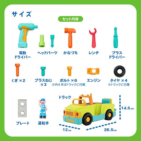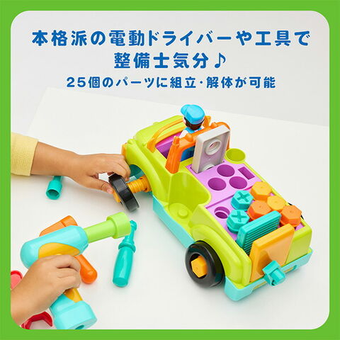| 商品説明 | ●対象年齢:18か月から ●楽しい音楽を鳴らして走るDIYトラック ●様々な工具を使いながら手先の器用さを育める ●本格派の電動ドライバーや工具で整備士気分 ●25個のパーツに分解が可能で、組立・解体を何度でも楽しめる ●運転手の人形が付属で、ごっこ遊びにも ●使用電池:単3電池×3本、単4電池×2本(別売り) |