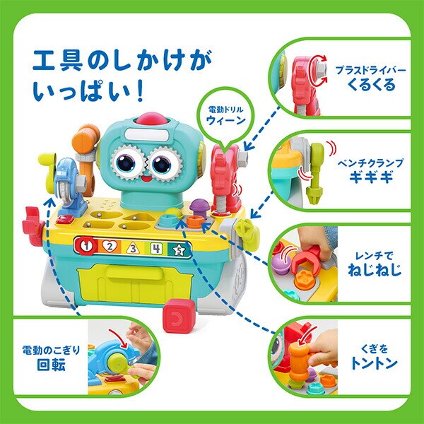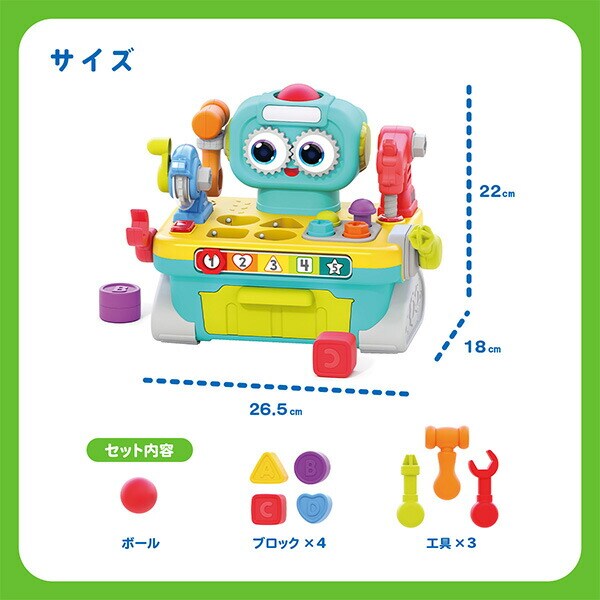| 商品説明 | ●対象年齢:12か月から ●工具遊びや型はめ遊びが楽しめる、しかけがいっぱいのロボット! ●ドライバーでカチカチねじ回しをしたり、ハンマーで叩いたり、工具のおもちゃで遊ぶことで指先の器用さを育める ●ボールを穴に落とすと音楽が鳴り目がくるくると回ったり、ブロックの型はめをすると英語でカタチの名前を教えてくれるしかけも ●形や色を覚えるのにもぴったりのおもちゃ ●単3×2本(別売り) |