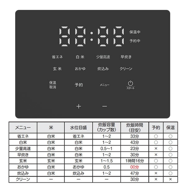 | 商品説明 | ●電源:AC100V(50/60Hz) ●消費電力:300W ●電源コード長:約1.2m ●最大炊飯容量(白米):2合(0.36L) ●炊飯方式:マイコン ●メニュー:省エネ、白米、少量高速、早炊き、玄米、おかゆ、炊込み、クリーン ●保温:炊きあがると自動で保温モードへ ※3時間以上の保温はしないでください ●少量高速:0.5~1合のお米を約23分で炊き上げます ●予約:1-24時間まで30分刻みで設定可能 ●付属品:計量カップ、しゃもじ、電源コード ●メーカー保証:1年間 |