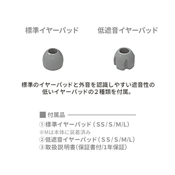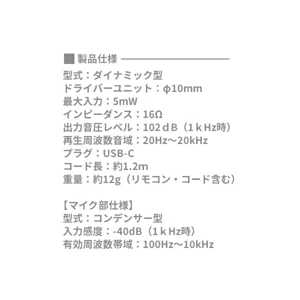 | 商品説明 | ●USB-C接続対応のハンズフリーステレオイヤホン ●通話マイク付きリモコン搭載 ●型式:ダイナミック型 ●ドライバーユニット:Φ10mm ●最大入力:5mW ●インピーダンス:16Ω ●出力音圧レベル:102dB(1kHz時) ●付属品:標準イヤーパッド(SS/S/M/L)、低遮音イヤーパッド(SS/S/M/L)、取扱説明書(保証書付/1年保証) 【マイク部仕様】 ●型式:コンデンサー型 ●入力感度:40dB(1kHz時) ●有効周波数帯域:100Hz~10kHz |