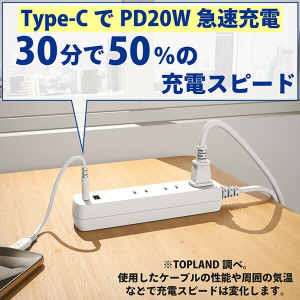 電源タップ スマートコードタップ 2m コンセント 3個口 USB 2ポート PD20W TPD20 コンセントタップ 電源 OAタップ USB-A USB-C PD対応 充電器 充電ポート トラッキング防止 トップランド TOPLAND 【送料無料】