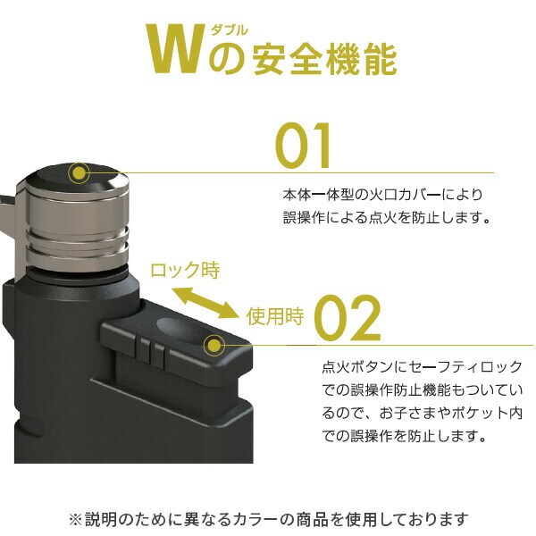 | 商品説明 | ●使用時は火口を伸ばして安全に。収納時は縮めてコンパクト ●暗がりでも見つけやすい蓄光ボディ ●燃料は充填式で経済的 ●携帯性や操作性をより向上させた新モデル ●スリムになって携帯性アップ ●点火ボタンに角度をつけ、より押しやすいように形状変更 ●手の小さい方にも使いやすいように本体底面形状を変更 ●ストラップホールを拡張し、ガイライン等を通しやすいように形状変更 【Wの安全機能】 ●本体一体型の火口カバーが誤操作による点火を防止 ●点火ボタンにセーフティロック付き、お子様やポケット内での誤操作を防止 ●炎温度:1300℃ ●使用燃料(充填式):ライターガス/カセットガス |
