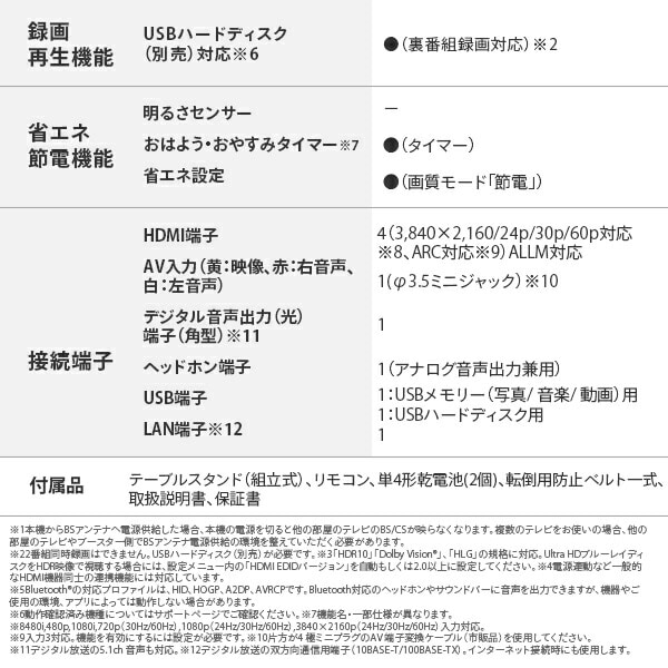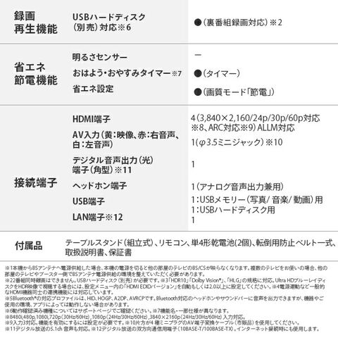 | 商品説明 | ●画面サイズ:55V型 ●画素数:3840×2160 ●消費電力:約139W ●待機時消費電力:0.5W ●年間消費電力量:108kWh/年 ●付属品:テーブルスタンド(組立式)、リモコン、単4形乾電池(2個)、転倒用防止ベルト一式、取扱説明書、保証書 ●OS:Google TV ●チューナー:BS 4K・110度CS 4K、地上デジタル(CATVパススルー対応)、BS/110度CSデジタル ●USB外付けハードディスク(別売)対応 ●HDR映像対応 ●メーカー保証1年付き |