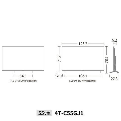 | 本体サイズ | 幅123.2×奥行9.2×高さ71.7cm 重量14kg スタンド幅:106.1cm(外側)/54.5cm(内側) スタンド取付時:幅123.2×奥行27.3×高さ78.5cm 重量14.5kg |