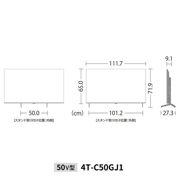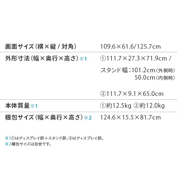 | 本体サイズ | 幅111.7×奥行9.1×高さ65cm 重量12kg スタンド幅:101.2cm(外側)/50cm(内側) スタンド取付時:幅111.7×奥行27.3×高さ71.9cm 重量12.5kg |