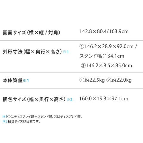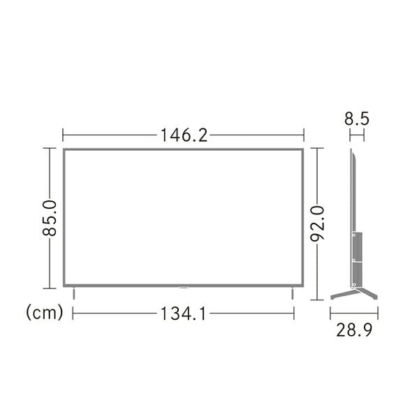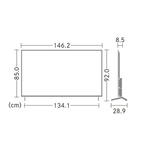 | 本体サイズ | 幅146.2×奥行8.5×高さ85cm 重量22kg スタンド取付時:幅146.2×奥行28.9×高さ92cm 重量22.5kg スタンド幅:134.1cm |