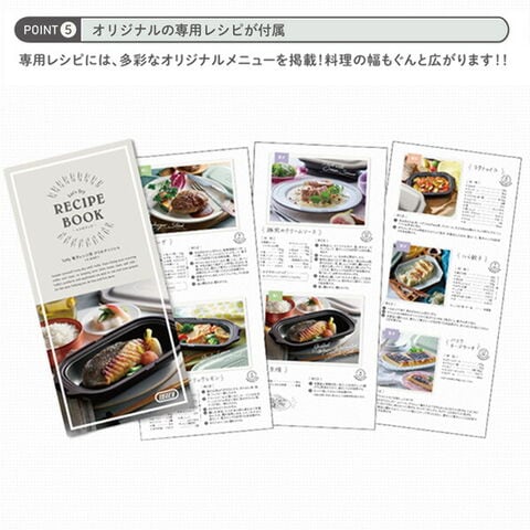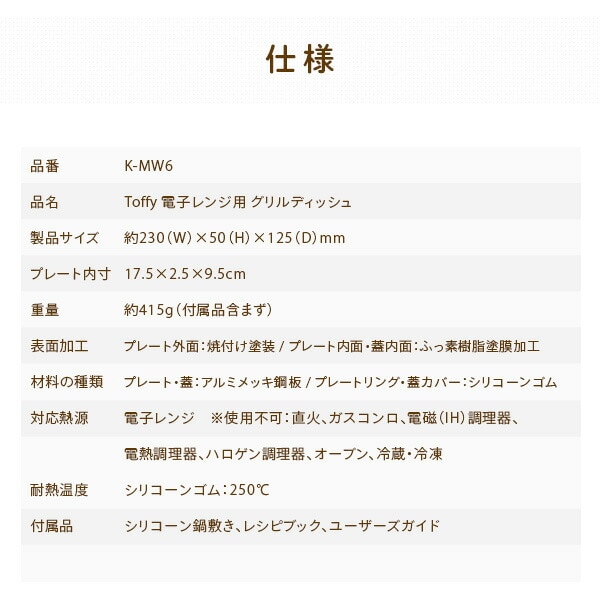 | 商品説明 | ●プレート内寸:幅17.5×奥行9.5×高さ2.5cm ●表面加工:プレート外面/焼付け塗装、プレート内面・蓋内面/ふっ素樹脂塗膜加工 ●対応熱源:電子レンジ※使用不可:直火、ガスコンロ、電磁(IH)調理器、電熱調理器、ハロゲン調理器、オーブン、冷蔵・冷凍 ●耐熱温度:シリコーンゴム250度 ●付属品:シリコーン鍋敷き、レシピブック、ユーザーズガイド |