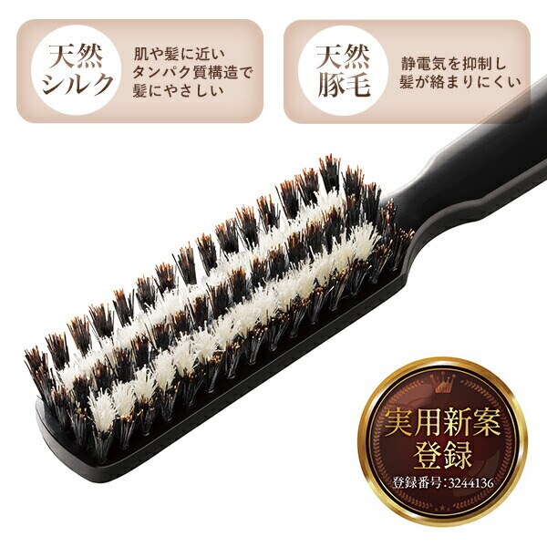 | 商品説明 | ●100%天然シルクと天然豚毛を組み合わせた日本製のこだわりブラシ ●約140本の繭糸を1本に撚り上げた極太シルク糸を使用 ●日本で唯一シルクの植毛ができる、植毛歴50年の職人の秘伝の技が詰まったブラシ ●シルクに含まれるセリシンは、保湿成分の高い水溶性タンパク質 ●天然の豚毛には油分が含まれているため、静電気が起こりにくい ●固めの豚毛でブラッシングすることで頭皮を程よく刺激 ●豚毛とシルクに段差を付けた2段植毛構造で、髪1本1本をしっかりとキャッチ ●耐熱温度:80℃ |