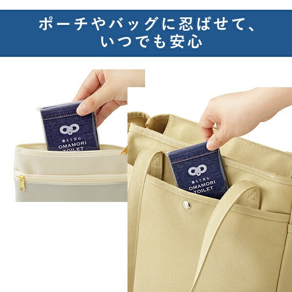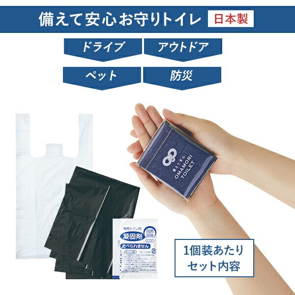 | 商品説明 | ●防災士監修の持ち歩ける非常用携帯トイレ ●防災トイレに見えないお洒落なお守りデザイン1回分個包装タイプ ●いつでもどこでも備えて安心のコンパクトサイズ ●抗菌剤入り凝固剤で菌の繁殖を抑えて臭いも安心 ●ドライブ時やアウトドア、登山や釣りなどのレジャーの不安を解消 ●渋滞時や嘔吐のエチケット袋、ペット用にも活躍 ●セット内容(1個装あたり):凝固剤1袋、排便袋(黒色)1枚、処理袋(白色)1枚 ●保存期間(目安):15年 |