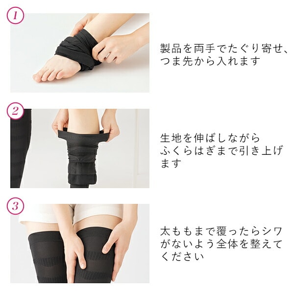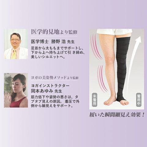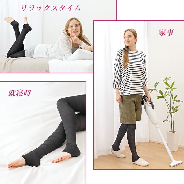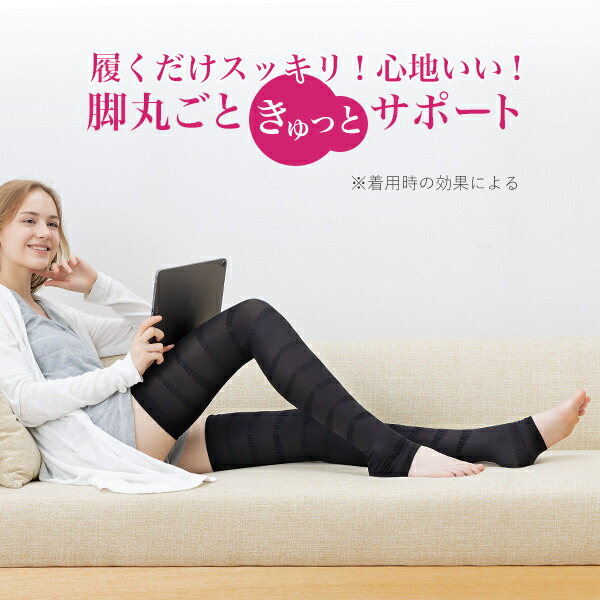 | 商品説明 | ●甲周りから太ももまでのフルレッグタイプの着圧サポーター ●専門家共同監修のサポーターラインで脚スッキリ ●お休み時やおでかけ時などお好みのタイミングで使える ●履いた瞬間細見え効果 ※着用時の効果による ●洗濯可(洗濯ネット使用) |