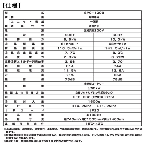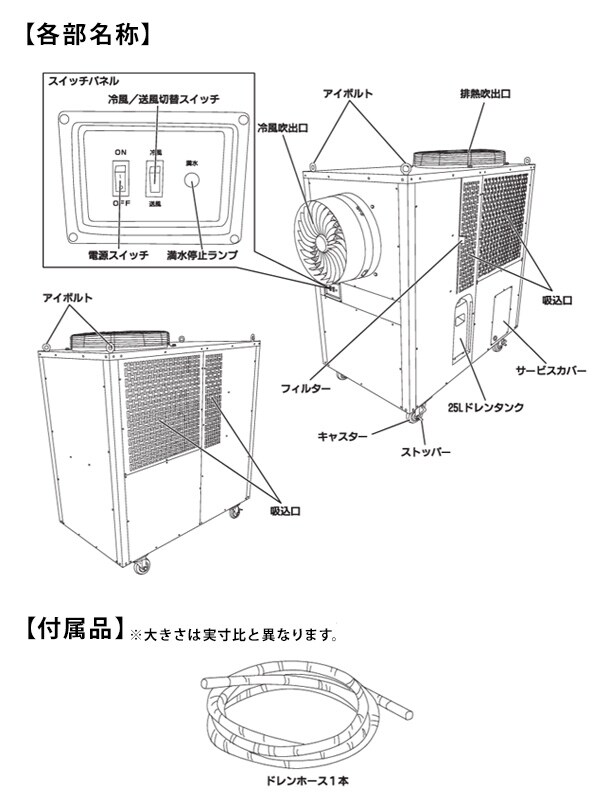 | 商品説明 | ●本製品はメーカーからの直送品です。 ご注文後、メーカーの在庫状況によっては在庫切れによりキャンセルとなる場合がございますので、あらかじめご了承ください。 ●本製品は個人宅への配送は行っておりません ※お届け先には法人名、施設名の確認ができる看板、表札が必要です ※ご注文の際はお届け先住所もしくはお届け先名に必ず「法人名・施設名・屋号」をご記入ください ●電源:三相200V 50/60Hz ●消費電力:3070/4000W ●タンク容量:25L ●冷房能力:8.3kW/10.0kW ●最大風速:8.99/10.01m/s ●風量:61/68[[M3]]/min ●自動首振り:無し ●騒音値:78/83dB ※「日本冷凍空調工業会JRA4040規格」に基づいて測定した数値 ●環境に配慮した冷媒R32を採用 オゾン層破壊係数ゼロ、地球温暖化係数(GWP)675の環境に優しいエコ冷媒 ●スポット強冷風タイプ:大型倉庫や大型工場内の広い空間や、コンテナ、トラックの積み込み場所の環境改善に最適 ●ドレンタンク(25L)採用で、直接排水が困難な場所も安心して使用可能 ●満水停止機能付きドレンタンク ●本体吊り上げ用のアイボルト付属 ●送風口にトルネードガードを採用し、約17m先へ冷風を送り出します ●排熱が直接かからないよう、上に排熱口を設置 ●サーマルプロテクター(復帰式過熱保護装置)内蔵で、モーターを過負荷や異常電流から保護します ●設置に関する注意事項 ・電源コードはついておりません 配線の長さに応じて、適切な太さのコードをご購入ください ・電源の接続には電気工事士が必要となりますので必ず電気工事士の有資格者、認定を受けた電気工事店にご相談ください ●配送に関する注意事項 ・本製品の配送は重量物であるため「車上渡し」となります 荷受人がトラックからの荷下ろし作業を行って頂く必要があります 製品によってはフォークリフトが必要な場合があります 荷受時には事前に人員の確保や搬入経路の確保をお願いします ※沖縄県、離島地域への配送はできません |