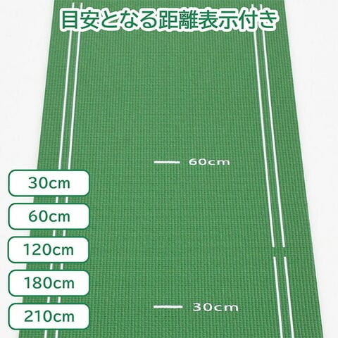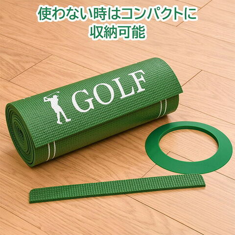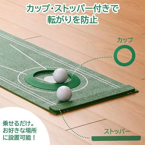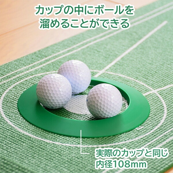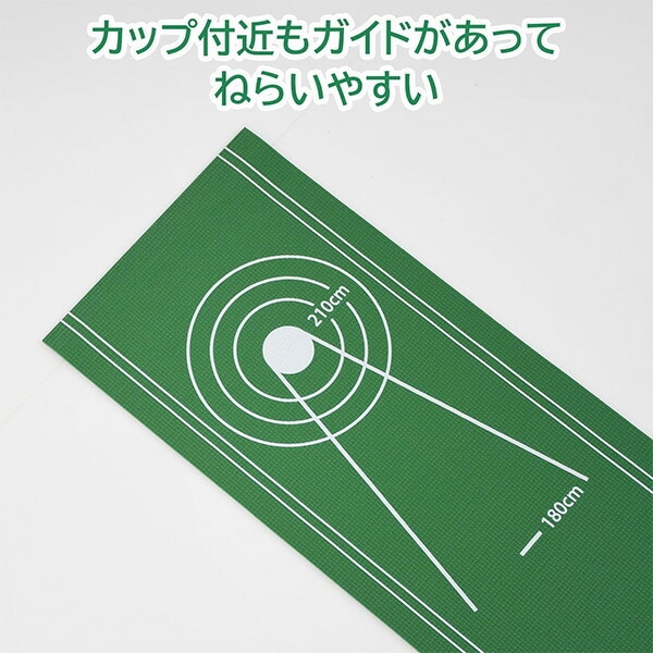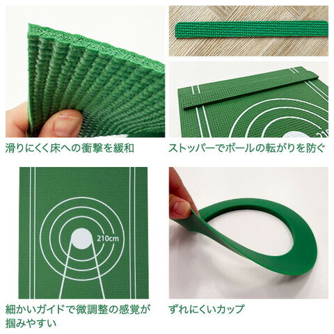 | 商品説明 | ●自宅でパターの練習ができるゴルフ練習器具 ●便利なカップとストッパー付きです ●使わない時もコンパクトに収納可能 ●置くだけなのでお好きな場所に設置できます ●カップの内径は本物と同じ108mm ●距離表示、ガイド付き。30、60、120、180、210cmの表記があるので距離の目安になります。カップ付近も様々なガイドがあるため微調整の感覚が掴みやすくなっています |