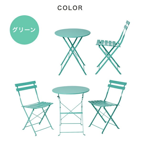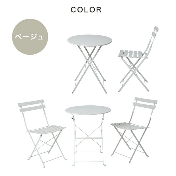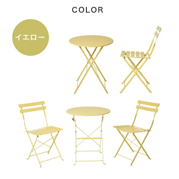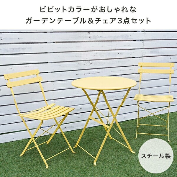 | 商品説明 | ●カラフルでおしゃれなガーデンファニチャー3点セット(テーブル1点、チェア2点) ●ベージュ/イエロー/グリーンの3色からお選びいただけます ●テーブル、チェアともに折りたたみ式なので使わないときはコンパクトに収納も可能 ●ベランダなどの省スペースにちょうどいいサイズ ●組立不要なので届いてすぐに使える ※加熱した鍋や湯沸かし等を直接置かないでください |