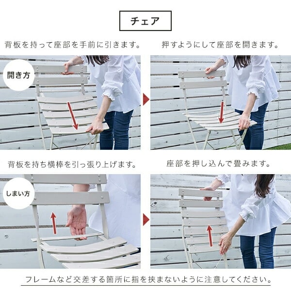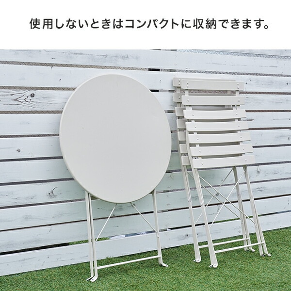 | 本体サイズ | テーブル:幅60×奥行60×高さ70cm 重量5.2kg (収納時)幅60×奥行4.5×高さ92cm チェア:幅41×奥行49.5×高さ77.5cm 座面高46cm 重量4.3kg (収納時)幅41×奥行18.5×高さ110cm |
