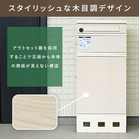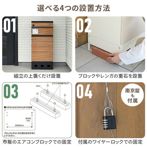 | 商品説明 | ●簡単組立の大容量3段タイプの宅配ボックス ●屋外設置が可能な防雨設計(防水規格 IPX4取得) ●雨の水滴から宅配物を守ります ※完全防水ではありません ●大容量:(2段目)約17L、(3段目)約71L ●地面の結露や湿気、ホコリから荷物を守る底上げ仕様を採用 ●ブロックやレンガなどの重石を設置できるのでアンカー不要 ●市販のエアコン室外機ブロックを使用して取付可能 ●本体底部には結露から荷物を守るための穴付き底板仕様 ●アウトセット扉を採用することで正面から本体の側板が見えずスタイリッシュな見た目に ●おうちに馴染むシンプルな木目調デザイン ●高級な風合いの大理石調デザイン ●シリンダーワンプッシュ錠:簡単操作で押すだけで施錠可能 ●宅配業者様向けメッセージプレートと印鑑置きは磁石で好きな位置に貼り付けが可能 ●盗難・転倒防止用ワイヤー付属 ●付属品:印鑑置き(マグネット2個付き)、宅配業者様向けメッセージプレート(マグネット)、鍵×2本、盗難防止用ワイヤー(ダイヤル式鍵付き)、プラスドライバー |