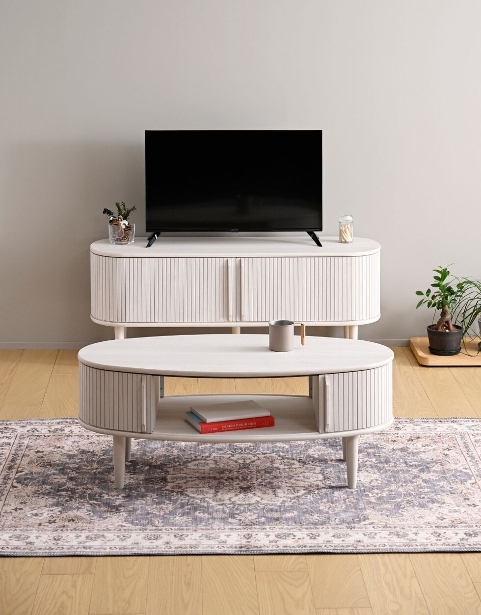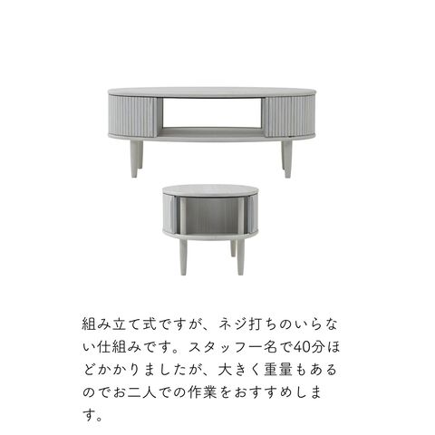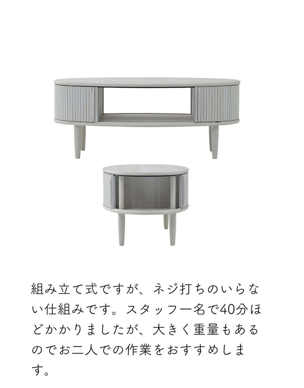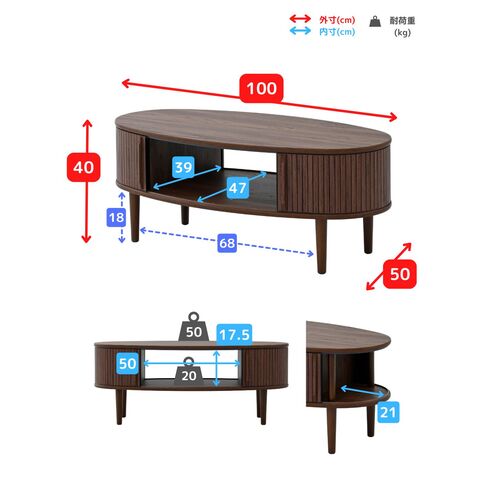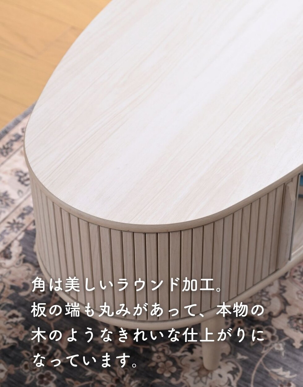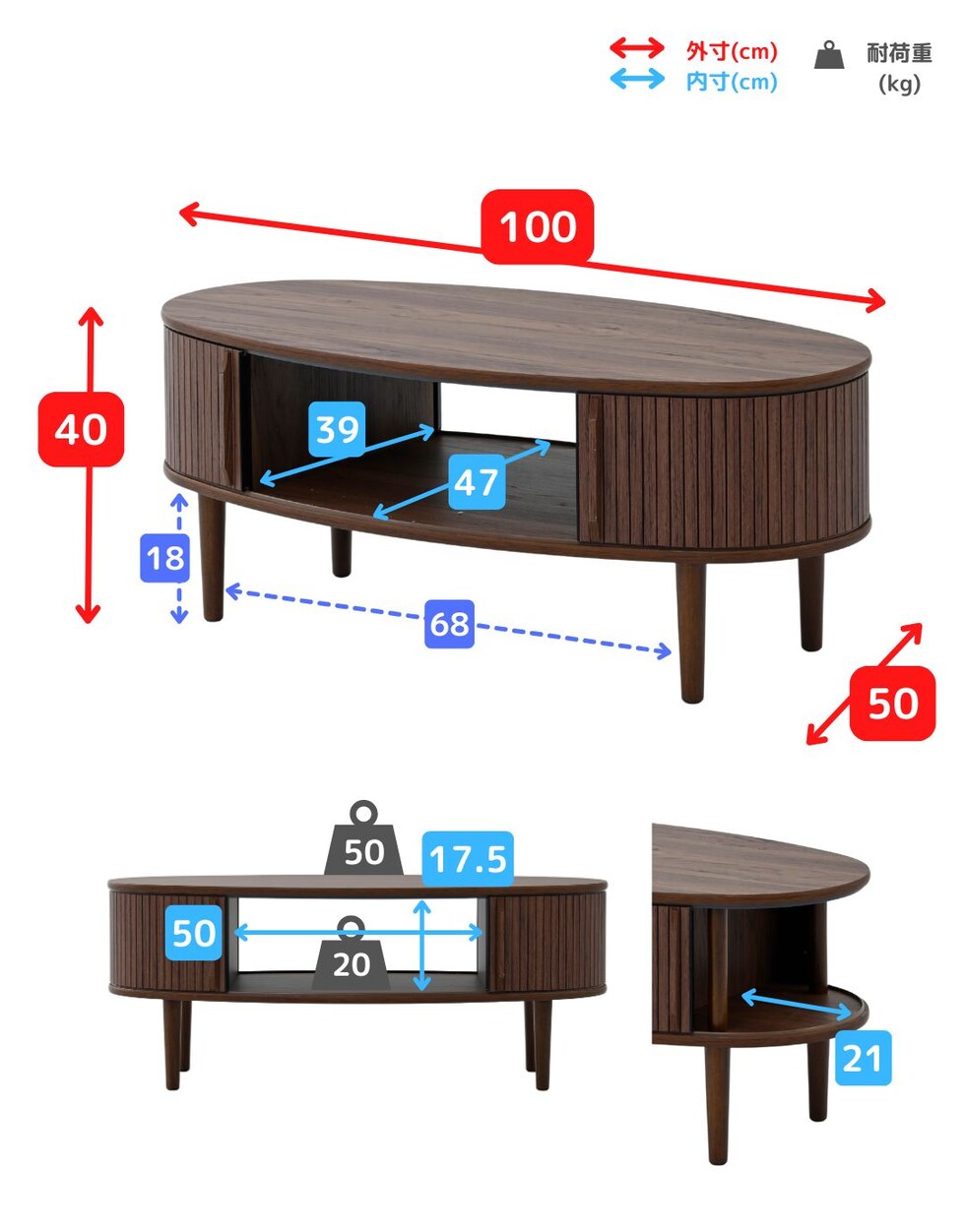 | 商品説明 | ●工具不要(素手のみで組み立て可能) ●かわいい楕円型のローテーブル ●両端に、引き戸式で場所を取らない扉収納付き ●引き戸はジャバラ式なので、省スペースに隠す収納 ●中央はオープン棚収納 ●木目の美しいシートで、木のような質感を再現 ●角も丸みのある加工で優しいデザイン ●脚高18cmで、掃除もしやすくロボット掃除機も進行可能 ●耐荷重:天板50、棚板20、全体70kg ●中央部: 幅50 奥行39-47 高さ17.5(内部19)cm ●両端扉内に柱あり、収納部内寸: 幅最大21 奥行最大38cm ●脚部下内寸: 幅68* 高さ18cm |