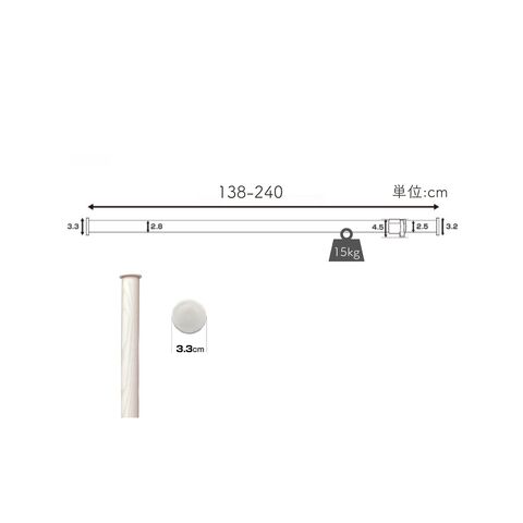 | 商品説明 | ●インテリアに馴染む物干し竿 ●ギラギラせずお部屋の色合いに合う無地のアイボリー ●壁紙用のシートを使用したきれいなホワイト木目柄 ●レバーロックのオン/オフで幅138-240cmで伸縮可能 ●パイプ径:(大)2.8cm/(小)2.5cm ●先端キャップ部直径3.3cm ●耐荷重: 15kg(均等荷重) ※ホスクリーンやナスタの竿受けなどでお使いいただけます。耐荷重や受けの直径などはお手元の竿受けを事前にご確認ください。 ※外干し用ではありません。 |