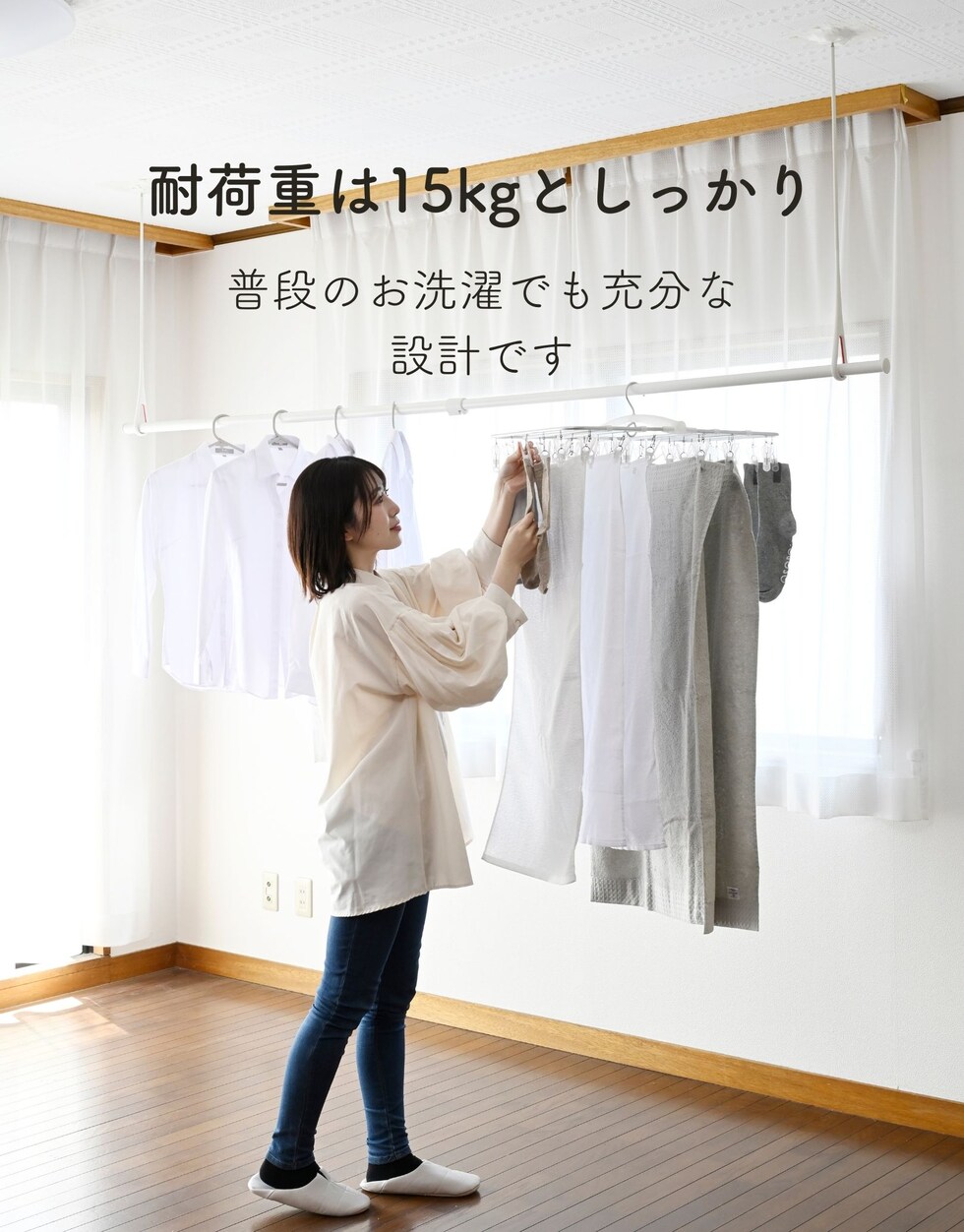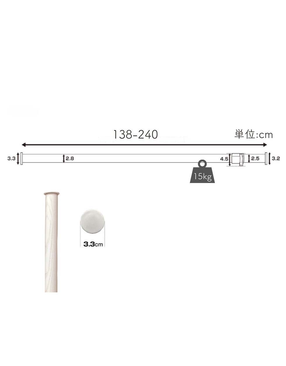 | 商品説明 | ●インテリアに馴染む物干し竿 ●ギラギラせずお部屋の色合いに合う無地のアイボリー ●壁紙用のシートを使用したきれいなホワイト木目柄 ●レバーロックのオン/オフで幅138-240cmで伸縮可能 ●パイプ径:(大)2.8cm/(小)2.5cm ●先端キャップ部直径3.3cm ●耐荷重: 15kg(均等荷重) ※ホスクリーンやナスタの竿受けなどでお使いいただけます。耐荷重や受けの直径などはお手元の竿受けを事前にご確認ください。 ※外干し用ではありません。 |