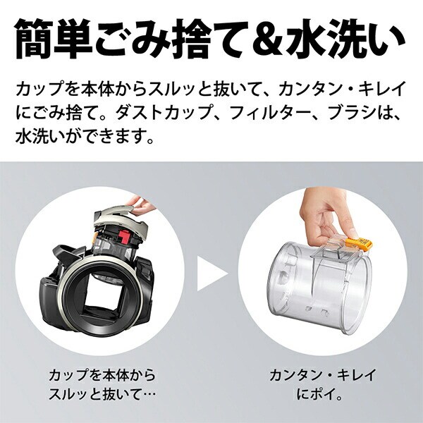 | 商品説明 | ●からみにく~いブラシ 密度が高く縮れたブラシを採用することで、毛の入り込みを抑制、ブラシに髪の毛やペットの毛がからみにくくなりました ●軽量ボディ2.4kg 軽量設計に加え、スリムな本体とデカ車輪で狭い場所もスイスイ移動 ●遠心分離サイクロン ごみと空気を高速旋回気流で強力に遠心分離。分離されたごみをカップの底に残し、フィルターへのごみの付着を抑えます ●自走パワーアシスト ブラシの回転する力でヘッドが前進するのをアシストするので、軽い力でお掃除できます ●自動エコモード搭載 フローリングやカーペットなどの床面を判別し、運転を自動制御。消費電力を最大約40%削減 ●簡単ごみ捨て&水洗い ダストカップ、フィルター、ブラシは水洗い可能 ●集じん方式:遠心分離サイクロン ●電源方式:電源コード式 ●吸引仕事率:300W~約60W ●消費電力:850W~約240W ●運転音:66~約58dB ●集じん容積:0.25L ●コード長さ:5.0m ●付属品:すき間ノズル |
