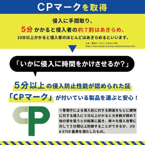 | 商品説明 | ●CPマーク基準適合品!「防犯性の高い建物部品」の認定(CP認定)を受けた防犯フィルム ※CPマークとは警察庁による侵入犯に対する調査をもとに建物に対する侵入に5分以上かかると大多数が諦めて他の家を狙うとの結果に基き、様々な侵入攻撃に対して5分間以上防御することができるか、JIS A 5759 基準を満たしたもの ●安心な日本製、厚み0.45mm、強固な4層フィルム構造の厚みと強靭さを兼ね備えた防犯フィルム ●窓ガラスに貼ることで、窓を割りにくくし、ガラス破りからの侵入を防ぎます!厚みの薄い地震対策の飛散防止フィルムとは違い、防犯用フィルムとしてご家族の安全を守ります ●飛散防止!地震や台風などの災害時にガラスが割れても鋭利な破片が飛び散らないので事前に飛散を防ぐことができ、事故や怪我防止にも役立ちます |
