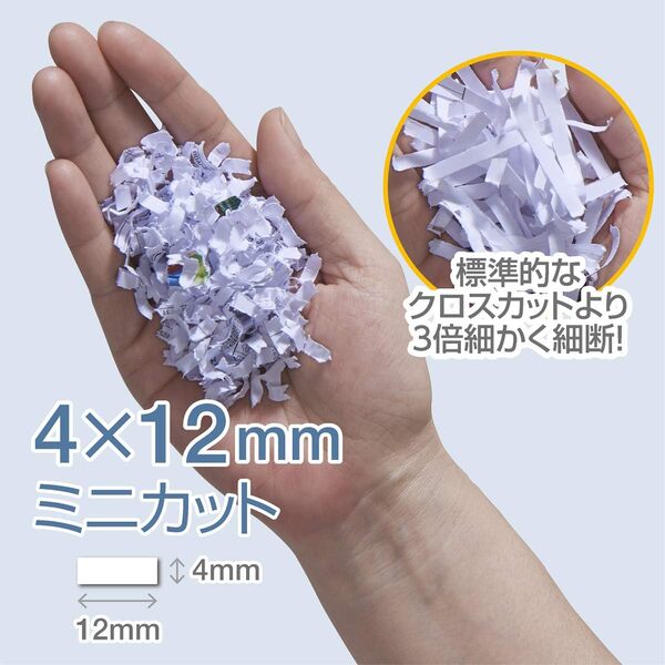 | 商品説明 | ●30分の連続使用に対応したデスクサイドシュレッダー ●一度に12枚まとめてスピード細断可能 ●シーンを選ばないホワイトカラーでオフィスにも家庭にもフィット ●キャスター付き ●カード・ホチキス・クリップ(28mm以下)対応 ●ミニカット(4×12mm) ●対応用紙サイズ:A4 ●最大細断枚数:12枚 ●連続使用時間:30分 ●ダストボックス容量:22.8L ●ゴミ袋サイズ:45L以上(市販品) ●コードの長さ:1.5m |