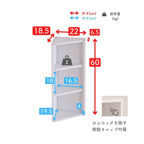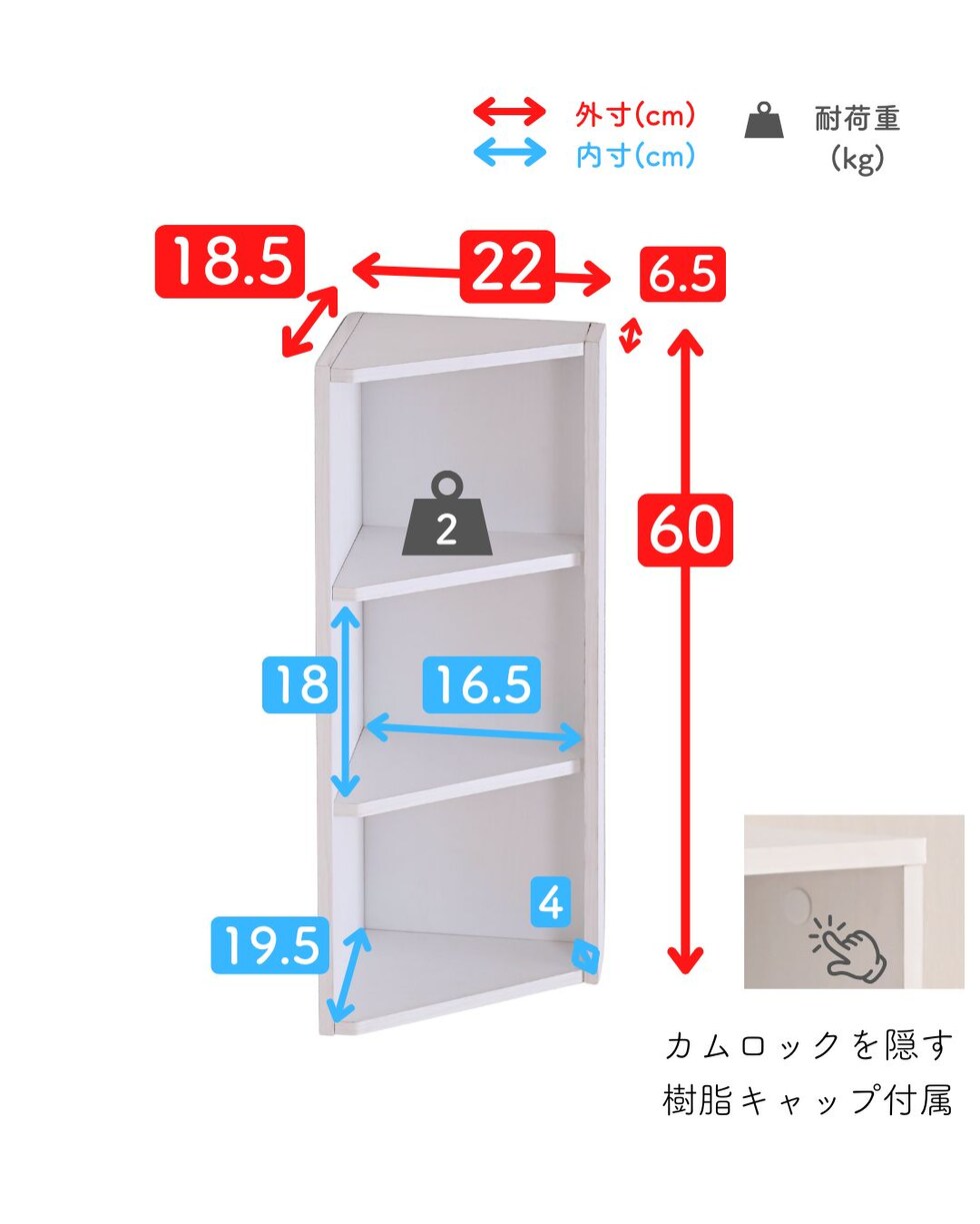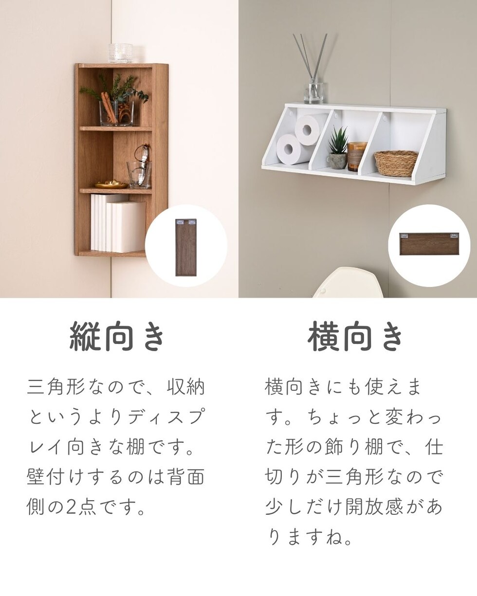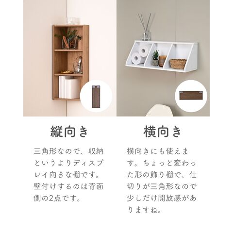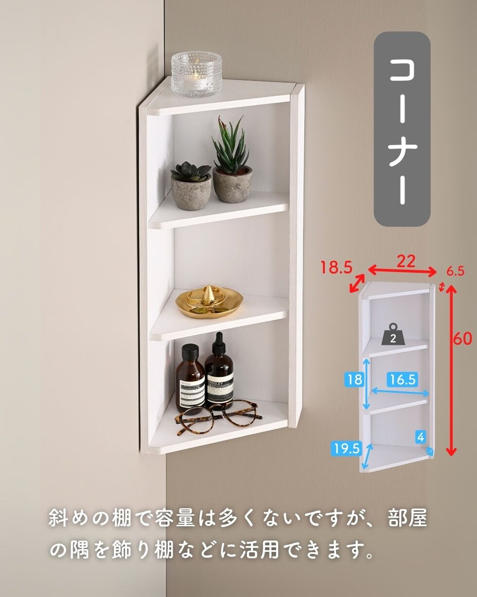 | 商品説明 | ●本体は完成品、付属ピンで石膏ボードに取り付ける壁掛け家具シリーズ 【賃貸でも使える、石膏ボード用ピンを採用】 ●取り付け穴が目立ちにくい細くて小さなピンを使用しているので、壁の傷を抑えて設置可能 ●付属石膏ボード用ピン:胴直径1×長さ20mm、頭部直径2mm、ステンレス製 ・付属の工具で作業はシンプルですが、ピンを押し込むのに力が必要です。 ・取り付けは付属の工具だけでできますが、取り外しの際は、別途お客様にてラジオペンチをご用意いただく必要がございます。 ※一般家庭の石膏ボード壁用製品です。 ※土壁や漆喰などのもろい壁や、コンクリートやべニア板などの硬い壁には設置できません。 ●部屋の隅を活用する、コーナータイプの収納ラック ●木のような凹凸のある質感の木目調シートを採用 ●小分け3段タイプ(固定棚) ●横向きで飾り棚としても活躍 ●耐荷重: 全体8kg、天板2、棚板1マスあたり2kg ●(コーナー)天板寸法:幅22 奥行6.5-18.5cm ●(コーナー)内寸: 幅19.5 奥行4-16.5 高さ18cm ●(ヨコ)天板有効寸法:幅60 奥行6.5cm ●(ヨコ)内寸: 幅18 奥行17 高さ19cm ●背面化粧あり ●背面留め具2か所 |