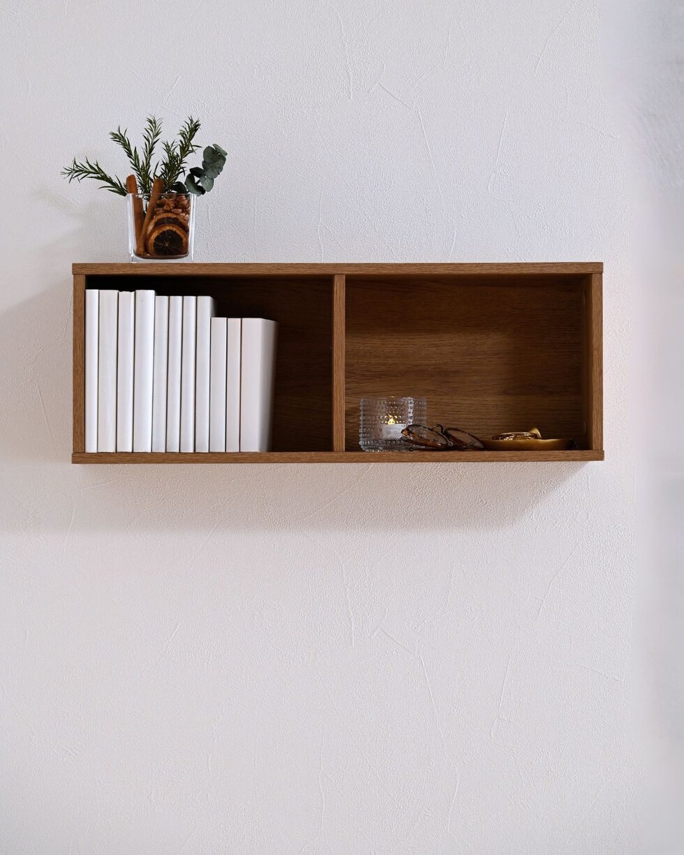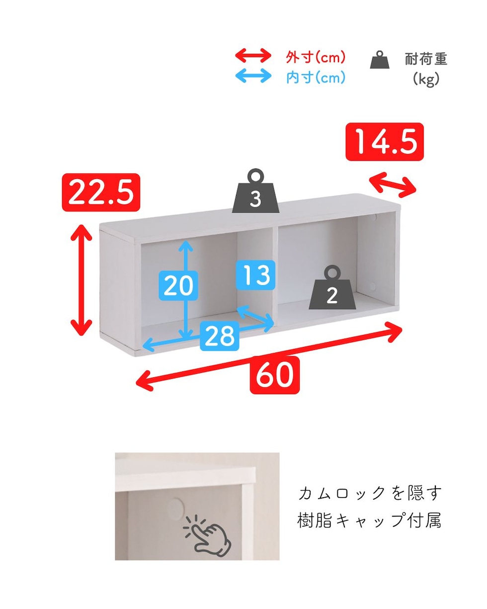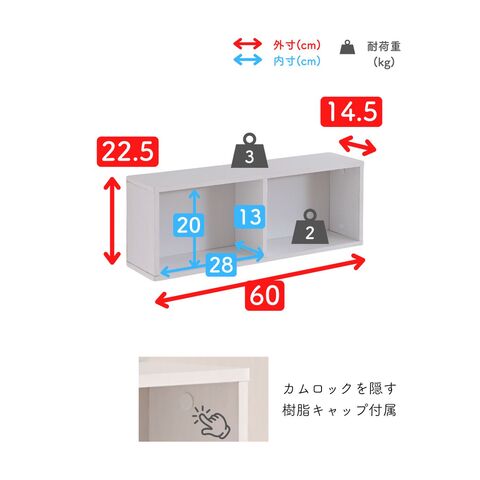 | 商品説明 | ●本体は完成品、付属ピンで石膏ボードに取り付ける壁掛け家具シリーズ 【賃貸でも使える、石膏ボード用ピンを採用】 ●取り付け穴が目立ちにくい細くて小さなピンを使用しているので、壁の傷を抑えて設置可能 ●付属石膏ボード用ピン:胴直径1×長さ20mm、頭部直径2mm、ステンレス製 ・付属の工具で作業はシンプルですが、ピンを押し込むのに力が必要です。 ・取り付けは付属の工具だけでできますが、取り外しの際は、別途お客様にてラジオペンチをご用意いただく必要がございます。 ※一般家庭の石膏ボード壁用製品です。 ※土壁や漆喰などのもろい壁や、コンクリートやべニア板などの硬い壁には設置できません。 ●ヨコにもタテにも使える、2マスタイプの収納ラック ●木のような凹凸のある質感の木目調シートを採用 ●耐荷重: 全体7kg、天板3、棚板1マスあたり2kg ●(ヨコ)天板有効寸法:幅60 奥行14.5cm ●(ヨコ)内寸: 幅28 奥行13 高さ20cm ●背面化粧あり ●背面留め具2か所 |