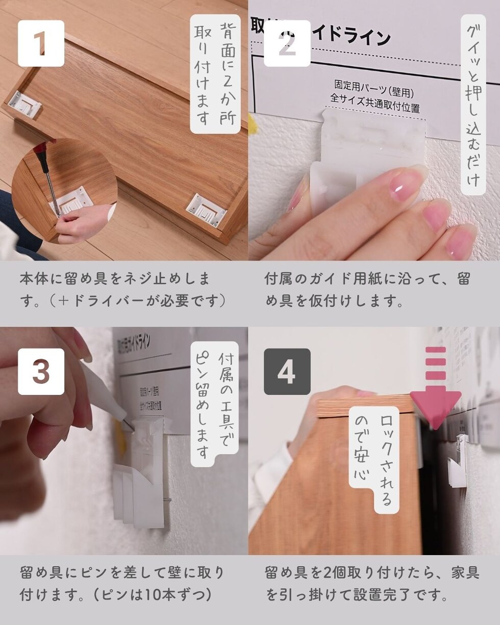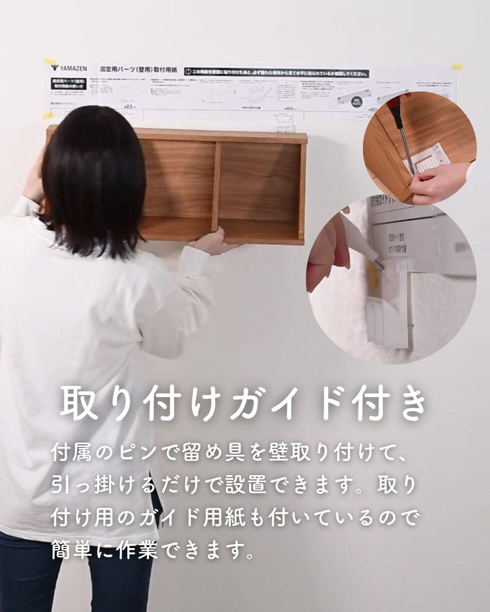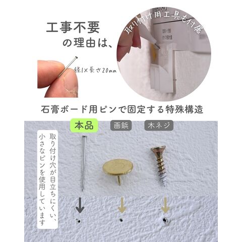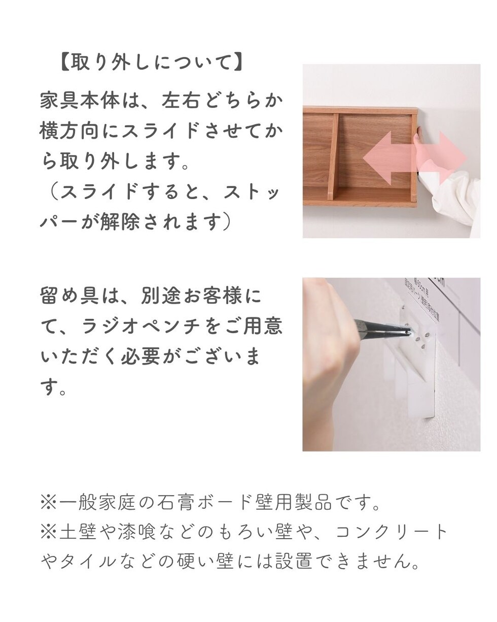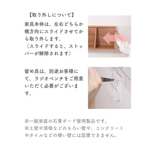 | 商品説明 | ●本体は完成品、付属ピンで石膏ボードに取り付ける壁掛け家具シリーズ 【賃貸でも使える、石膏ボード用ピンを採用】 ●取り付け穴が目立ちにくい細くて小さなピンを使用しているので、壁の傷を抑えて設置可能 ●付属石膏ボード用ピン:胴直径1×長さ20mm、頭部直径2mm、ステンレス製 ・付属の工具で作業はシンプルですが、ピンを押し込むのに力が必要です。 ・取り付けは付属の工具だけでできますが、取り外しの際は、別途お客様にてラジオペンチをご用意いただく必要がございます。 ※一般家庭の石膏ボード壁用製品です。 ※土壁や漆喰などのもろい壁や、コンクリートやべニア板などの硬い壁には設置できません。 ●中身を隠せる、引き戸式の隠す収納ラック ●木のような凹凸のある質感の木目調シートを採用 ●中央に仕切りのある2マスタイプ ●耐荷重: 全体7kg、天板3、棚板1マスあたり2kg ●天板有効寸法:幅60 奥行19cm ●内寸: 幅28 奥行15 高さ20cm ●背面化粧あり ●背面留め具2か所 |