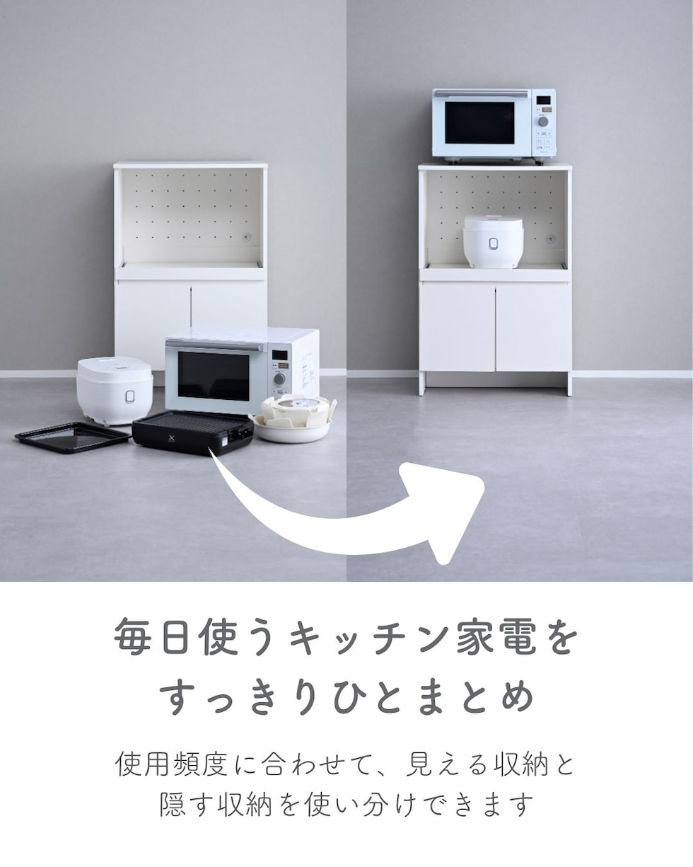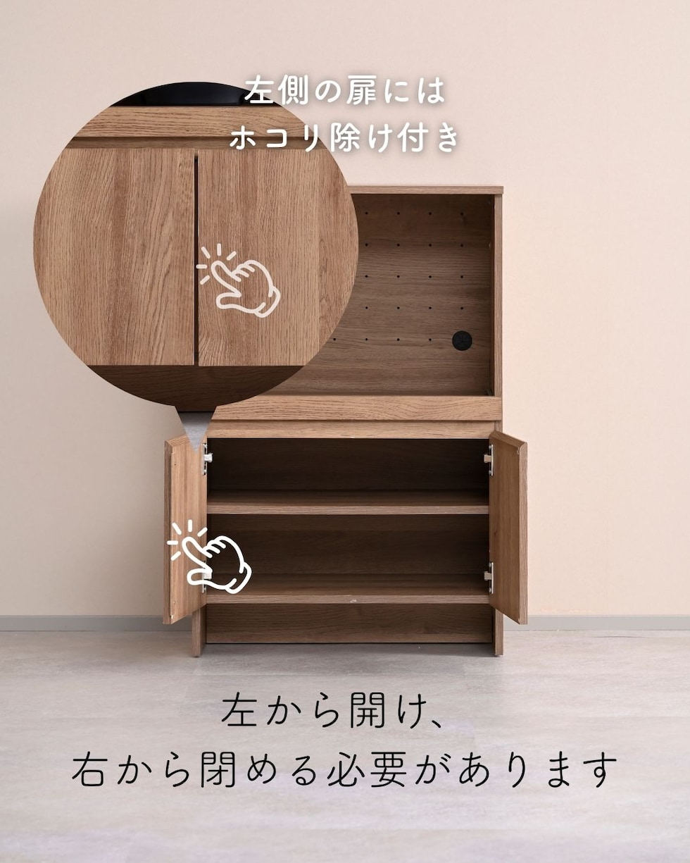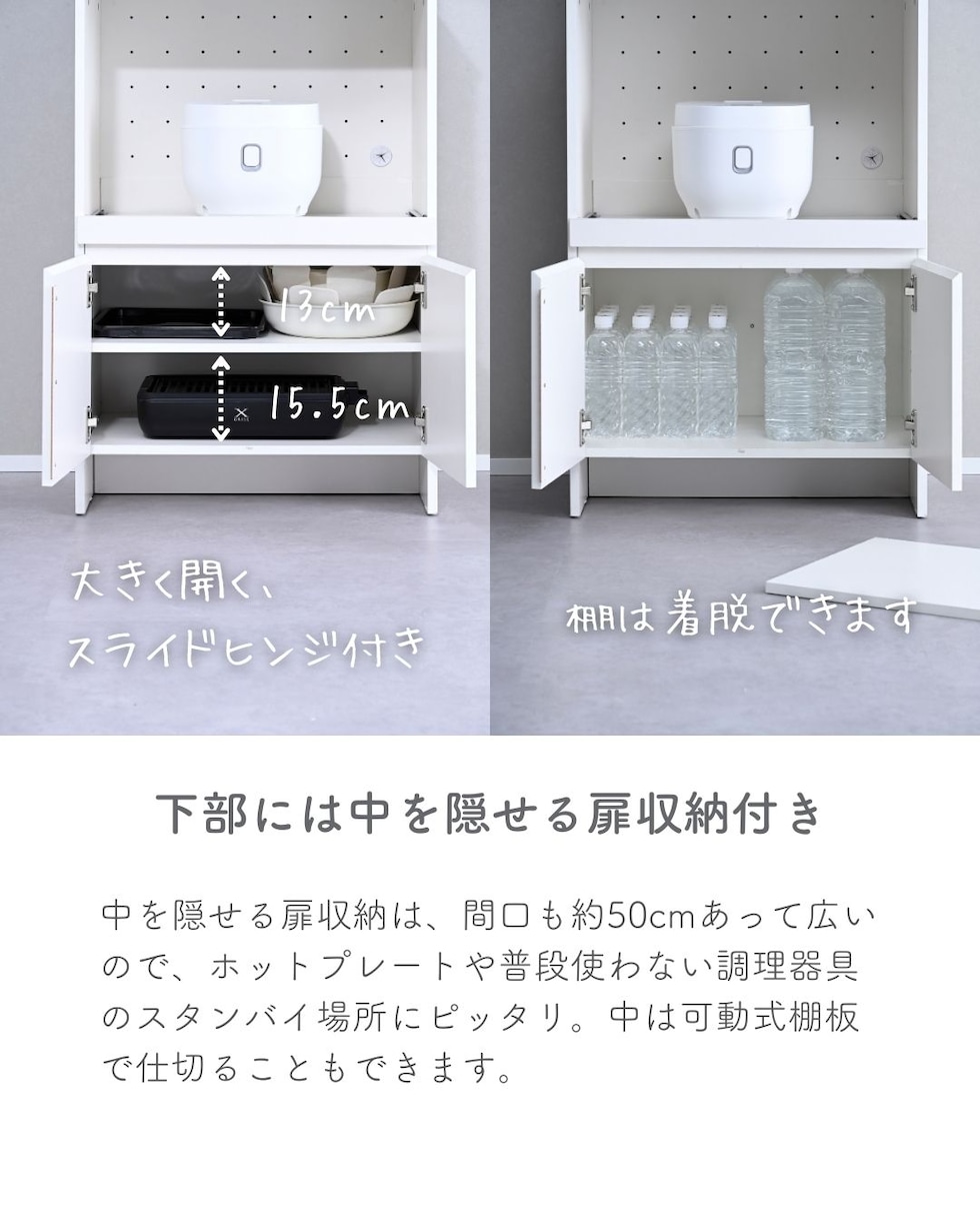 | 商品説明 | ●プラスドライバーをご用意ください。 ●家電を使いやすくする収納ラック ●下部には中を隠せる扉収納付き ●天板とスライド棚は水や汚れに強い、塩化ビニル樹脂加工 ●前後に出し入れできるスライド棚は、3合までの炊飯器はフタが干渉しないサイズ(5合炊きは少し当たります) ●スライド部の背板には通気孔と、配線コード孔あり ●耐荷重: 天板30kg、スライド棚9、可動棚1枚あたり15kg、全体69kg ●天板サイズ: 幅59 奥行40cm ●スライド棚内寸: 幅53 奥行33.5(35) 高さ40cm、スライド幅27cm ●スライド棚にはコード干渉を要望するざぐりがあり、ざぐりまでの棚奥行が33.5cm ●扉にはスライドヒンジ付き ●左側の扉にはホコリ除け付き ※左から開け右から閉める必要があります ●扉内寸: 幅51.5(55.5) 奥行35 全体高さ29.5cm ●可動棚を中央時:内寸高さ 上)13、下)15.5cm ●可動棚1枚、3.2cm間隔、3段階調整可能 ●扉収納部も地面から立ち上がっておりゴミの侵入を予防 ●背面化粧、背面揺れ止め(黒色)あり |