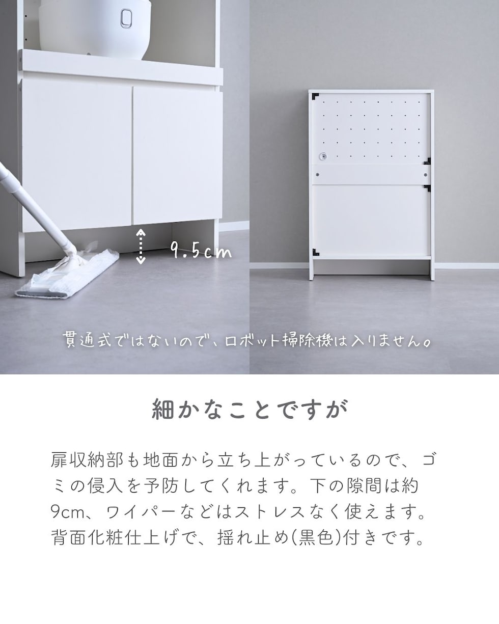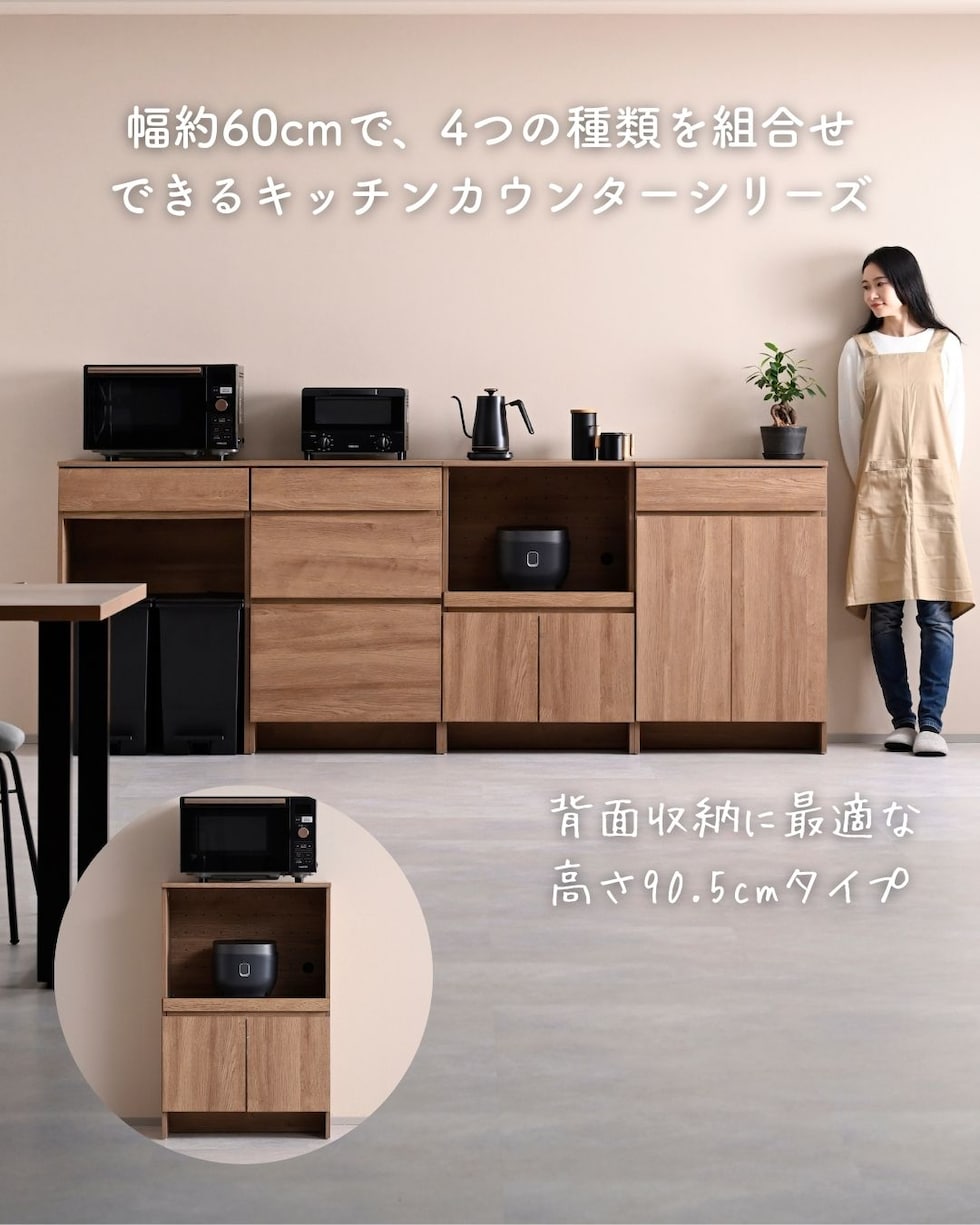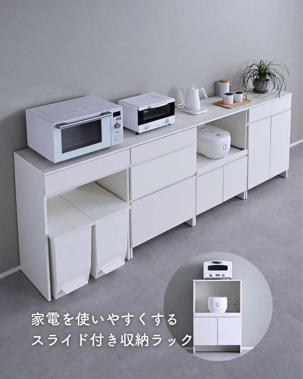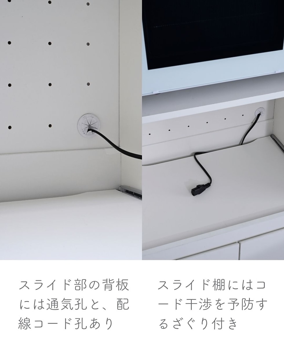 | 商品説明 | ●プラスドライバーをご用意ください。 ●家電を使いやすくする収納ラック ●下部には中を隠せる扉収納付き ●天板とスライド棚は水や汚れに強い、塩化ビニル樹脂加工 ●前後に出し入れできるスライド棚は、3合までの炊飯器はフタが干渉しないサイズ(5合炊きは少し当たります) ●スライド部の背板には通気孔と、配線コード孔あり ●耐荷重: 天板30kg、スライド棚9、可動棚1枚あたり15kg、全体69kg ●天板サイズ: 幅59 奥行40cm ●スライド棚内寸: 幅53 奥行33.5(35) 高さ40cm、スライド幅27cm ●スライド棚にはコード干渉を要望するざぐりがあり、ざぐりまでの棚奥行が33.5cm ●扉にはスライドヒンジ付き ●左側の扉にはホコリ除け付き ※左から開け右から閉める必要があります ●扉内寸: 幅51.5(55.5) 奥行35 全体高さ29.5cm ●可動棚を中央時:内寸高さ 上)13、下)15.5cm ●可動棚1枚、3.2cm間隔、3段階調整可能 ●扉収納部も地面から立ち上がっておりゴミの侵入を予防 ●背面化粧、背面揺れ止め(黒色)あり |