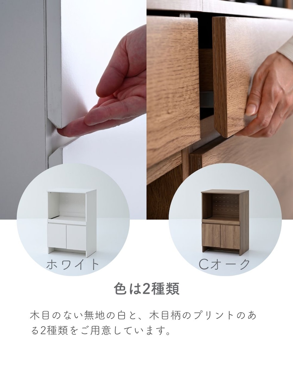 | 材質 | 天板・スライド棚: 合成樹脂化粧パーティクルボード(塩化ビニル樹脂) 本体: プリント紙化粧パーティクルボード、プリント紙化粧繊維板 |