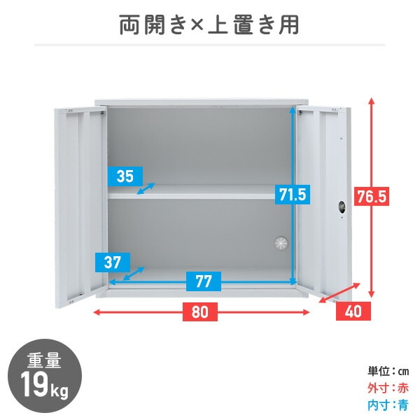 | 本体サイズ | 幅80×奥行40×高さ76.5cm 重量19kg 底板内寸法:幅77×奥行37cm 中棚内寸法:幅77×奥行35cm 内寸法高さ:71.5cm |